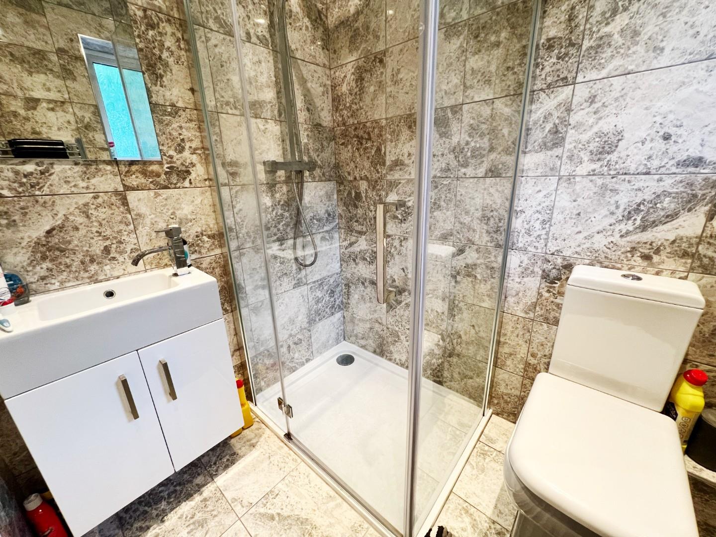 Shower cubicle, wash hand basin, WC, fully tiled, spotlights, extractor fan, central heating radiator and Upvc double glazed window.