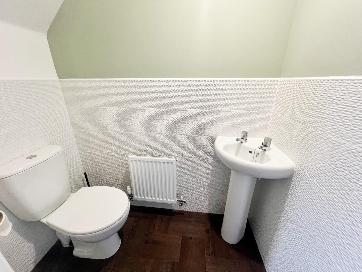 Low level wc, corner pedestal wash hand basin, tiled splashback, chrome effect fittings, extractor fan and Karndean flooring.