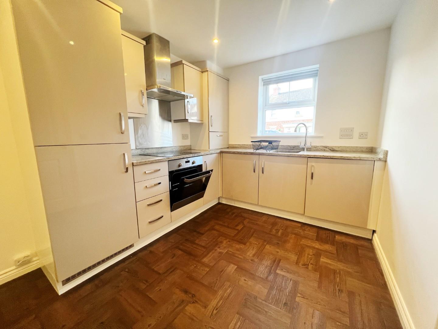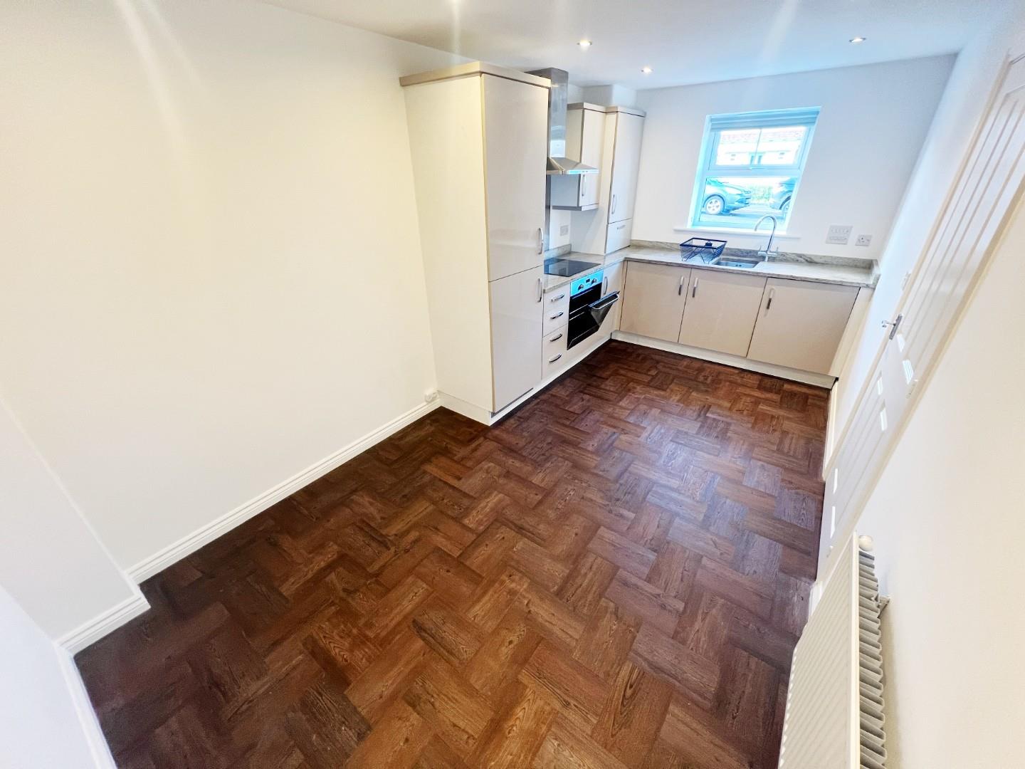Well presented contemporary style range of wall and base units, granite work surfaces, uPVC window to front elevation, stainless steel under mounted sink, chrome effect fittings, integrated washer, dryer, integrated fridge/freezer, ceramic hob, built in electric oven, boiler for domestic hot water and gas central heating, stainless steel splashback, stainless steel chimney style extractor hood, down lights to ceiling, TV point, space for dining room table, single central heating radiator.
