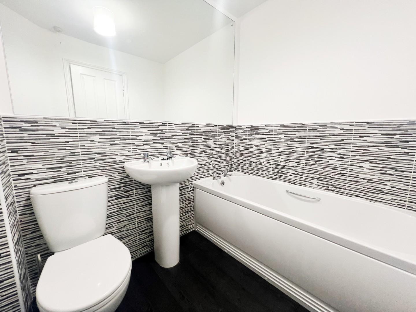 Fitted with a modern white suite comprising of panelled bath, pedestal wash hand basin, low level wc, chrome effect fittings, part tiled walls, feature wall mounted mirror and single central heating radiator.