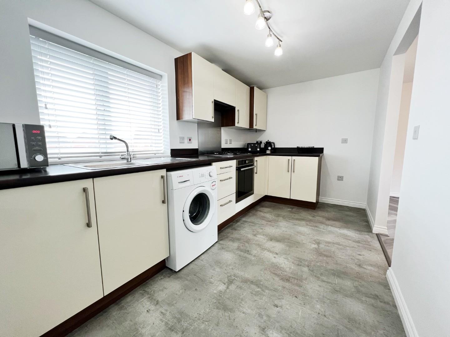Modern wall and base units, integrated oven, hob, extractor fan, plumbed for washing machine, stainless steel sink with mixer tap and drainer, uPVC window, radiator, space for fridge freezer.