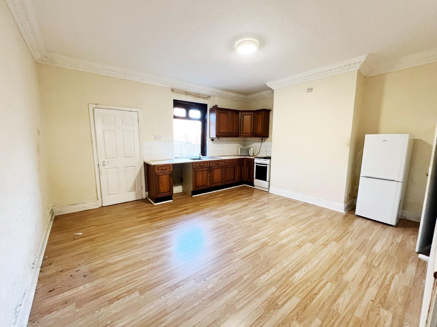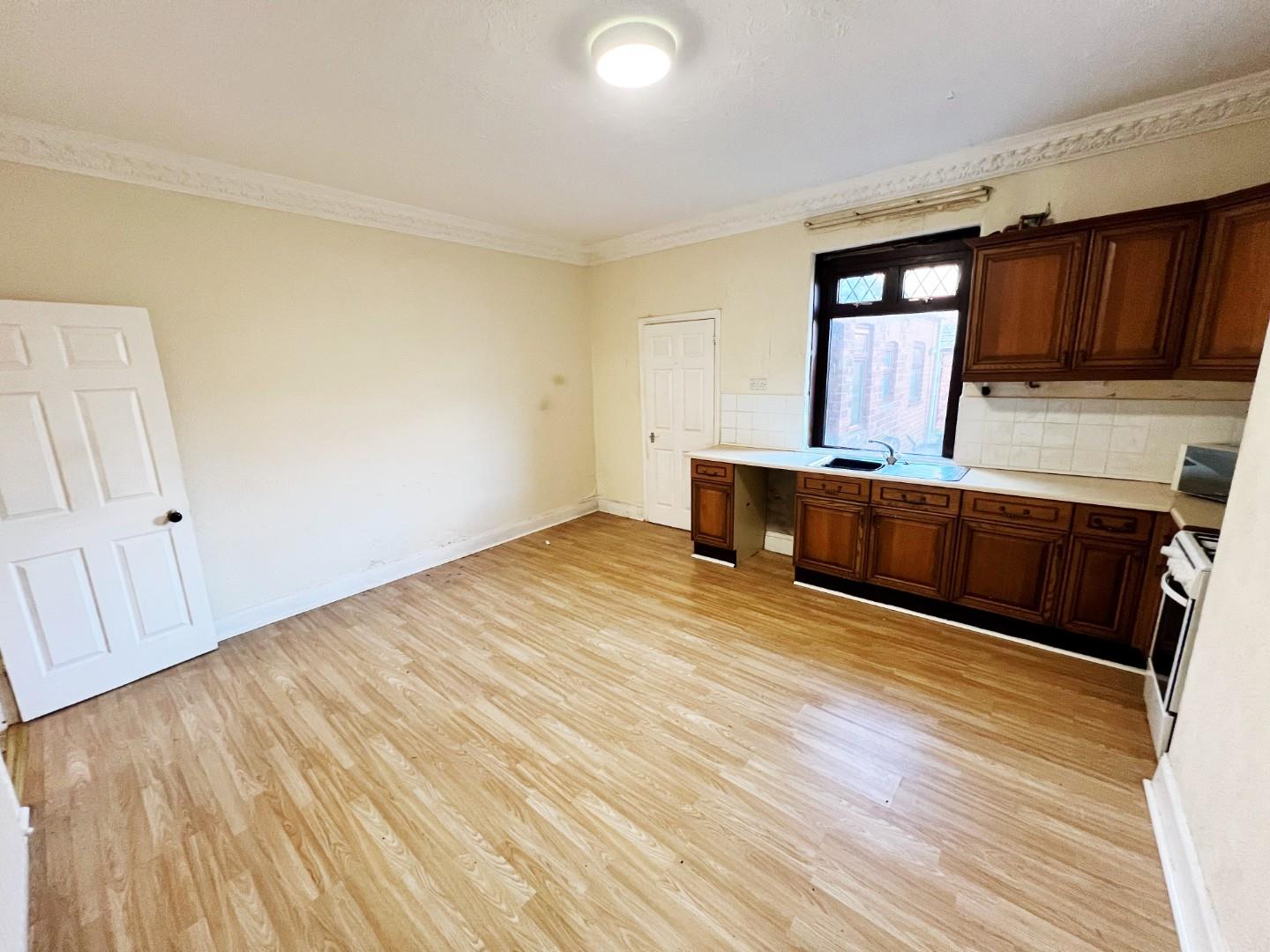 Wall and base units, stainless steel sink with mixer tap and drainer, tiled splashbacks, uPVC window, radiator, large storage cupboard, space for fridge freezer, space for dining room table.