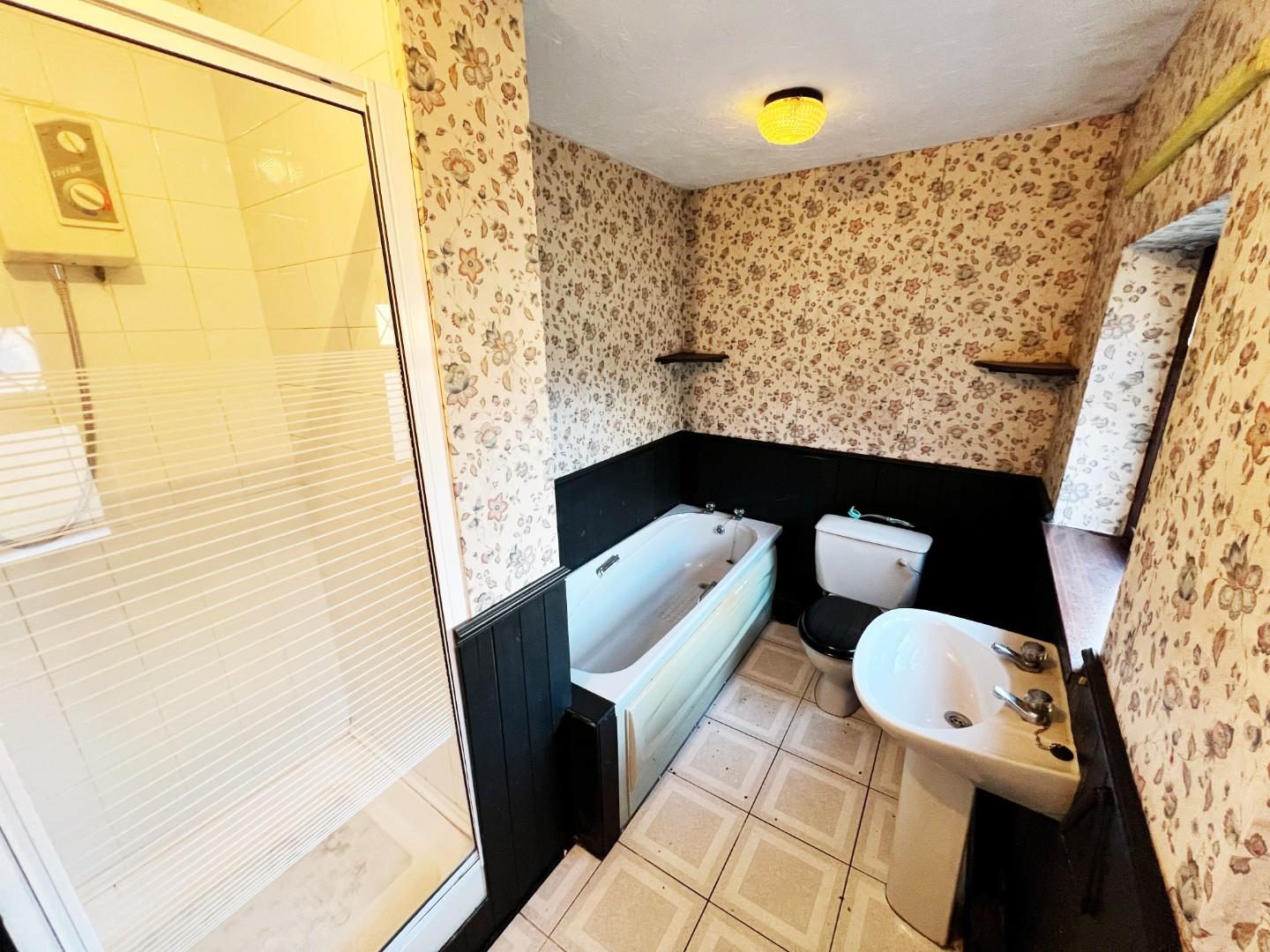 Panelled bath, separate shower cubicle, wash hand basin, W/C, uPVC windows.