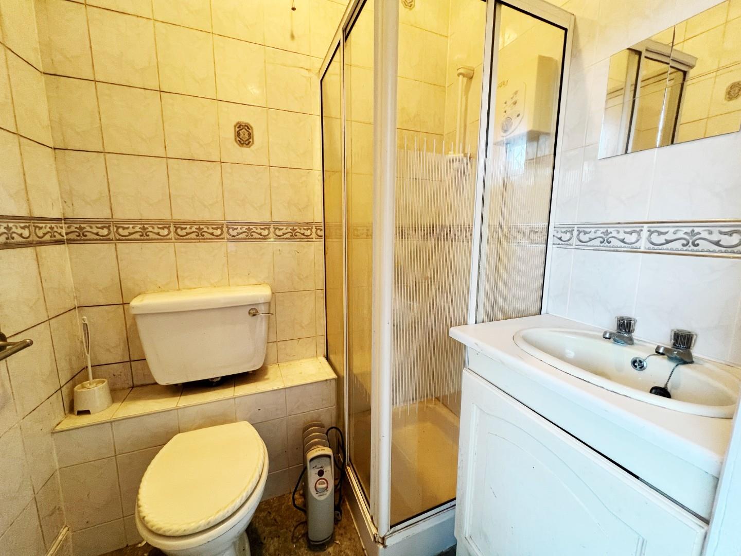 Shower cubicle, wash hand basin, W/C, tiled splashbacks.