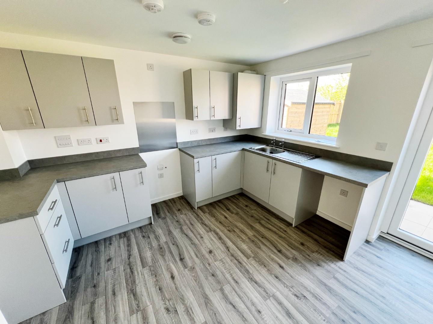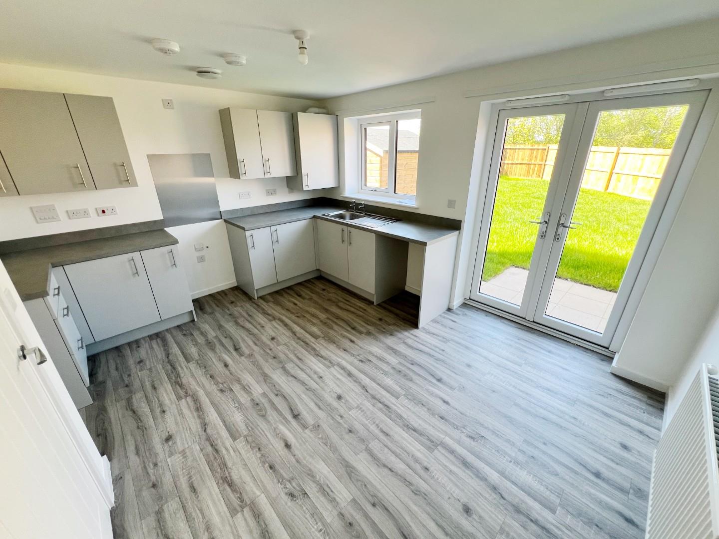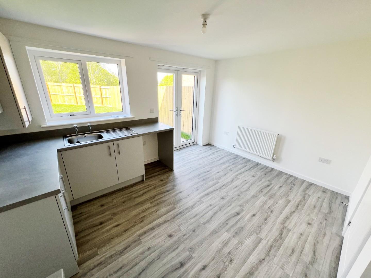 Morden wall and base units, space for oven, hob, extractor fan, space for fridge freezer, plumbing for washing machine, stainless steel sink with mixer tap and drainer, UPVC window, radiator, space for dining room table, French doors leading to the rear garden.