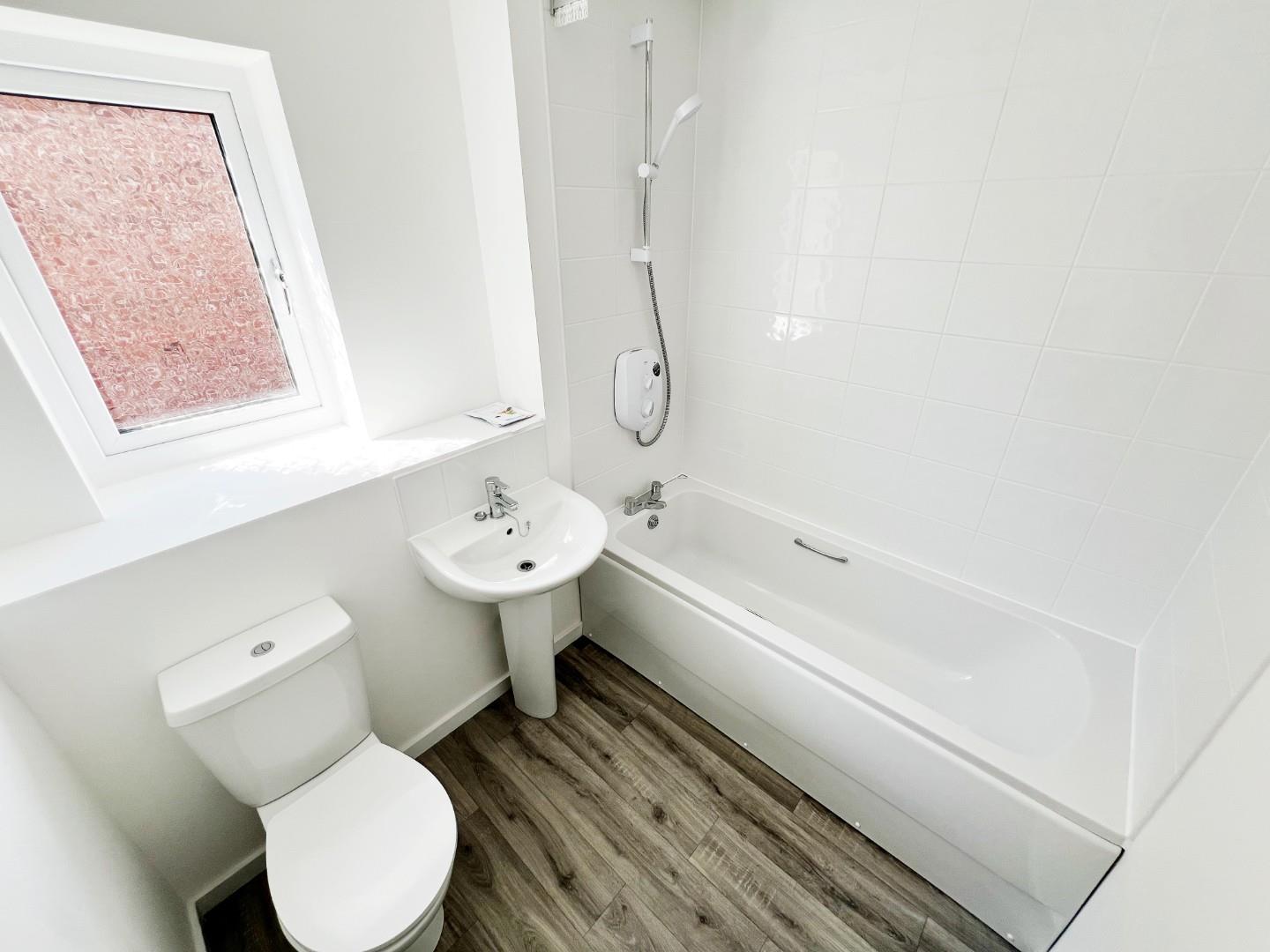 White panelled bath with shower over, wash hand basin, W/C, UPVC window, radiator.