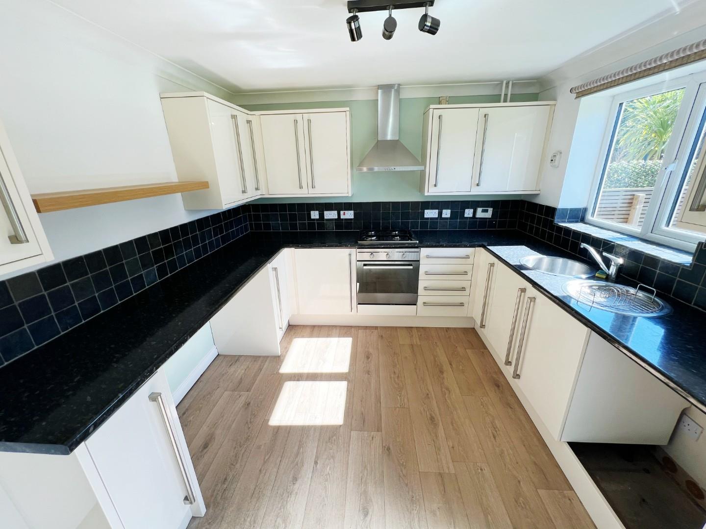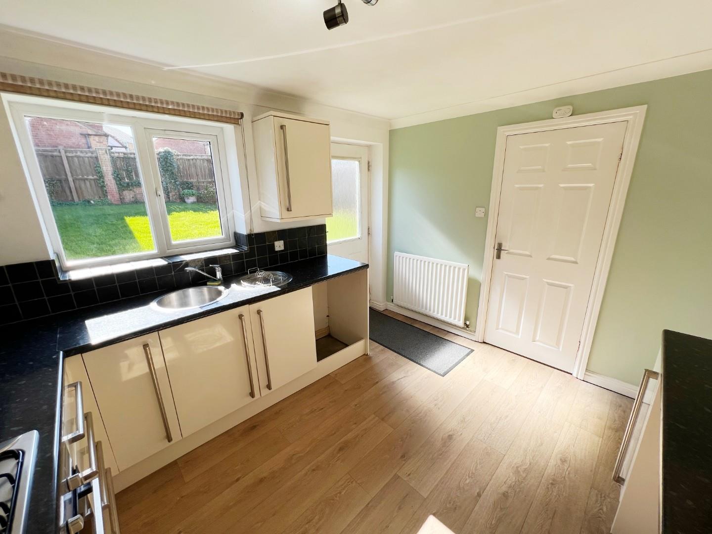 Morden wall and base units, integrated oven, hob, extractor fan, stainless steel with mixer tap and drainer, plumbed for washing machine, radiator, Upvc window, wood effect flooring, radiator, space for under counter fridge, tiled splash backs, large storage cupboard, access to rear.