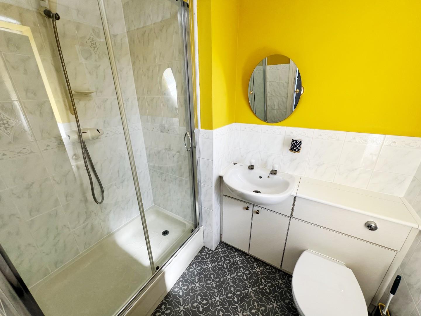 Double Shower cubicle, wash hand basin, W/C, tiled splash backs, Upvc window, radiator, extractor fan.