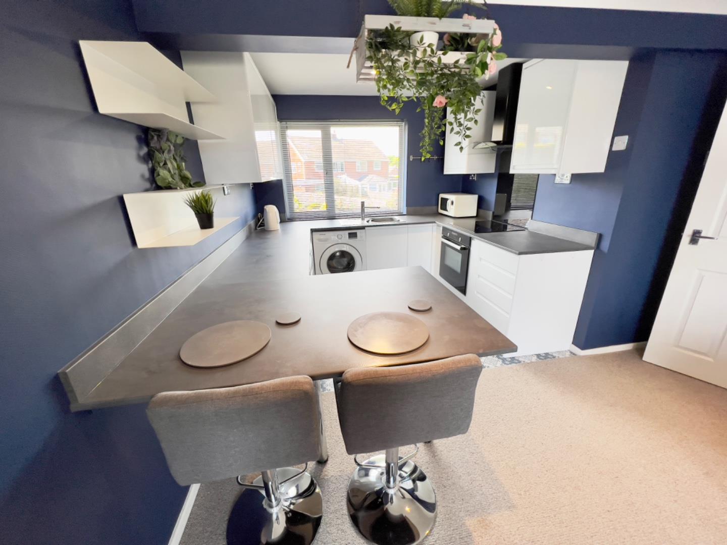 The property comes with sofa, breakfast bar chairs, double bed, dressing table, bed side units, storage unit, fridge, freezer, washing machine, oven and hob.