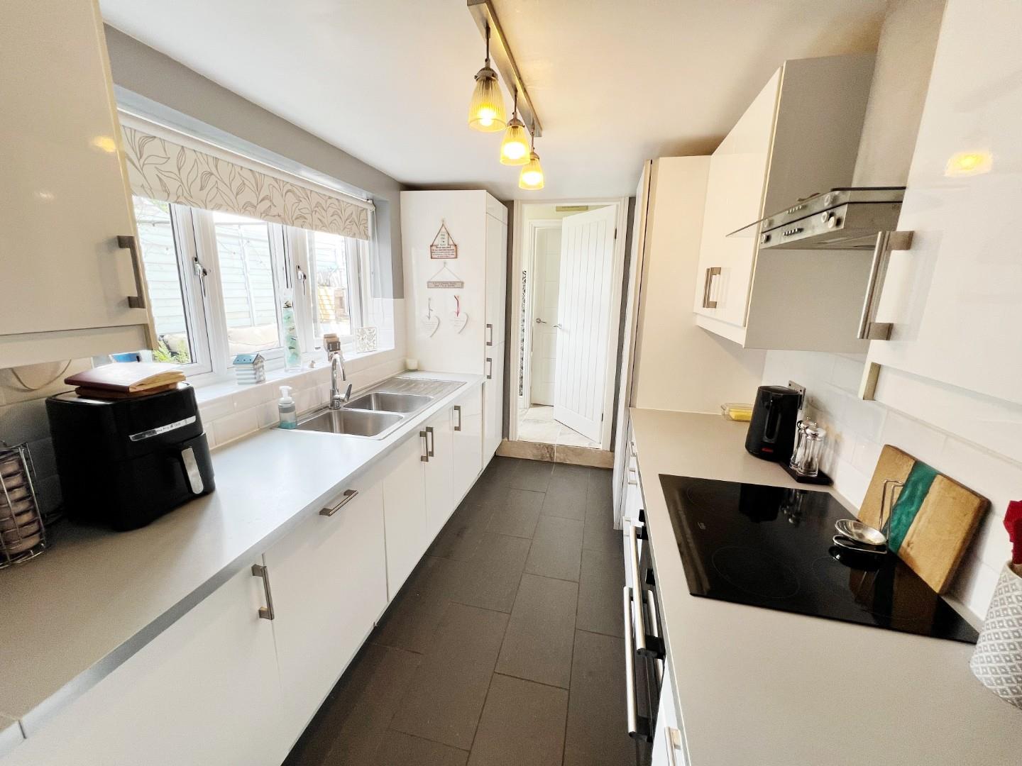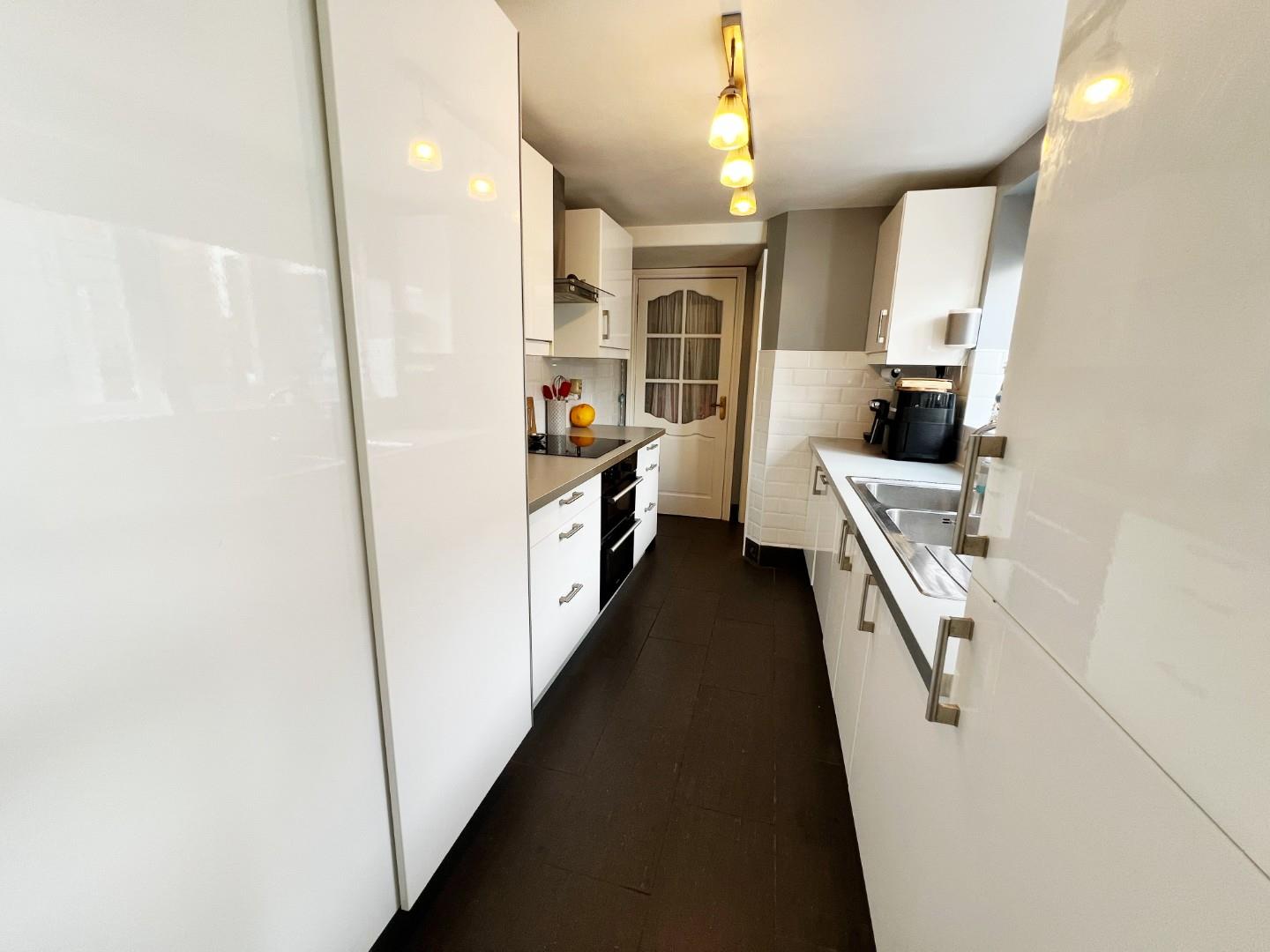 Morden white wall and base units, integrated oven, hob, extractor fan, dishwasher, fridge and freezer, larder unit, tiled splash back, tiled flooring, tiled splash backs, stainless steel sink with mixer tap and drainer and storage cupboard.