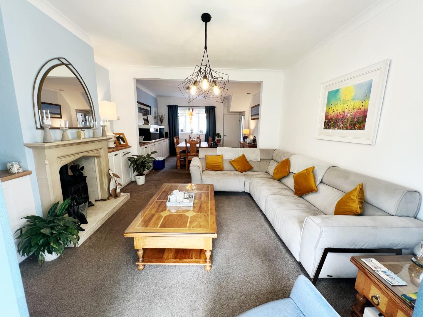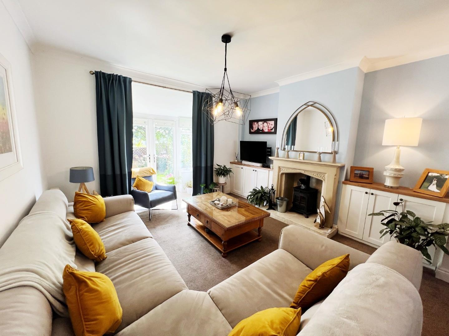 Log burning stove with stunning surround, radiator, storage cupboard, French doors leadings to the front elevation.