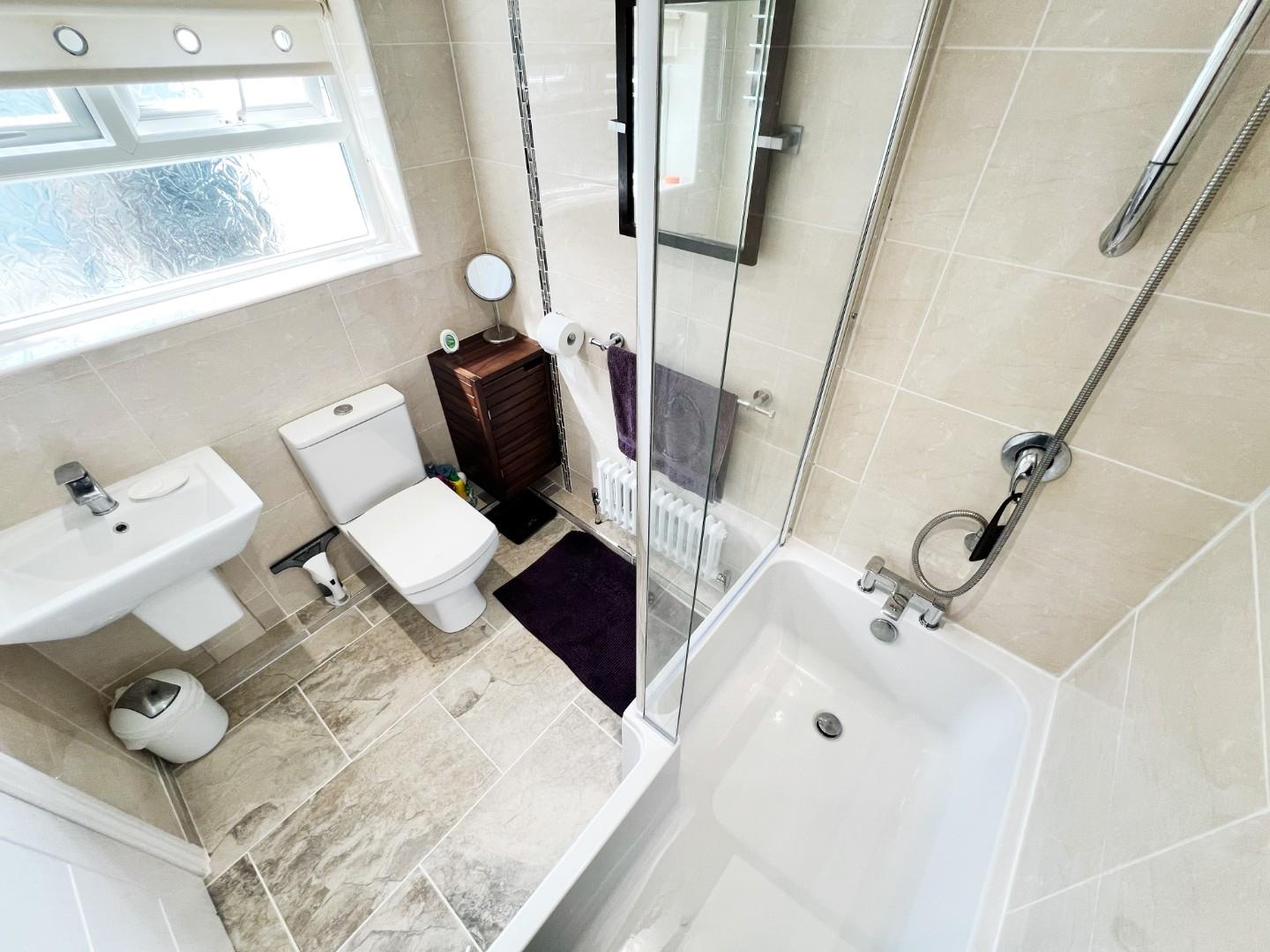 Large white panelled bath with shower over, wash hand basin, W/C, fully tiled with under floor heating, feature radiator and Upvc window.