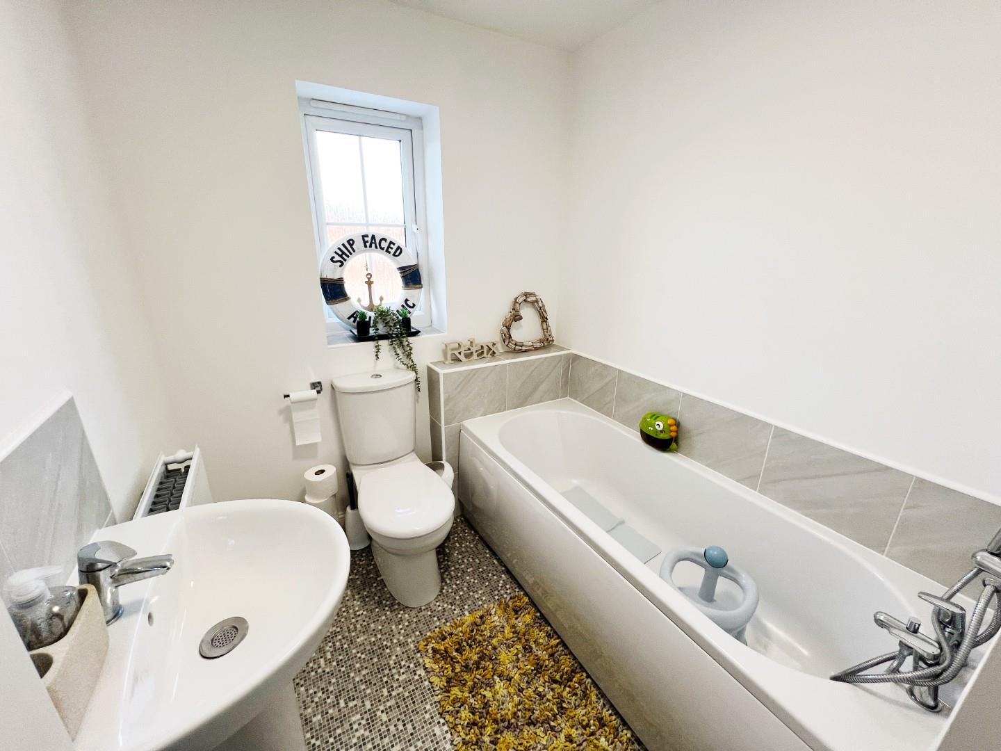 Panelled bath, wash hand basin, W/C, uPVC window, tiled splashbacks, extractor fan.
