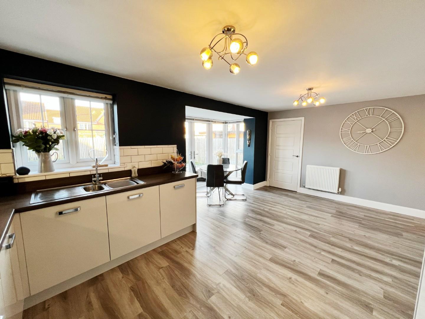 Modern wall and base units, integrated oven, hob, extractor fan, fridge freezer, dishwasher, stainless steel sink with mixer tap, tiled splashbacks, uPVC window, stylish flooring, radiators, french doors leading to rear, space for dining room table.