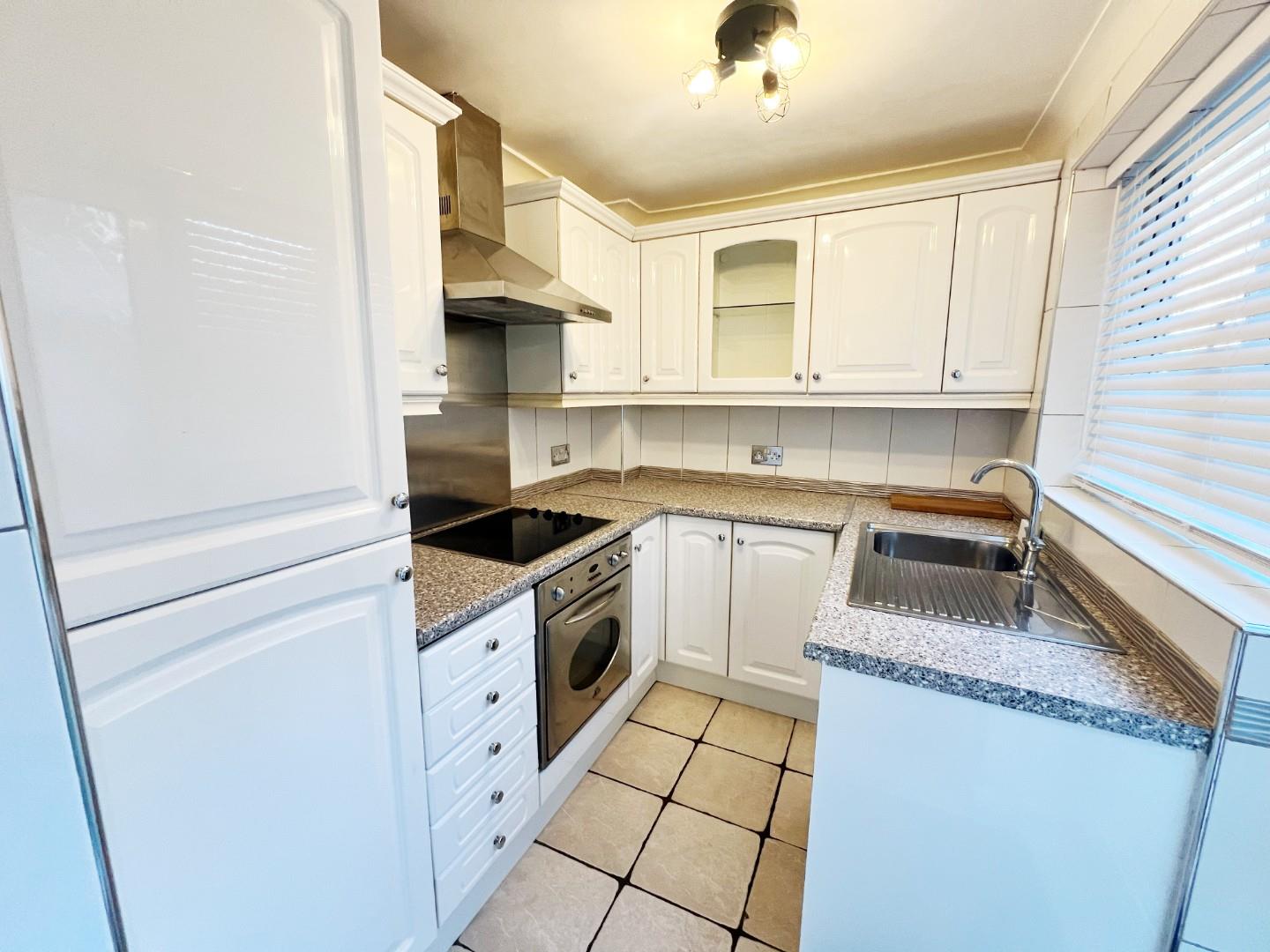 Wall and base units, integrated oven, hob, extractor fan, stainless steel sink with mixer tap and drainer, plumbed for washing machine, tiled splashbacks and flooring, uPVC window, access to the rear.