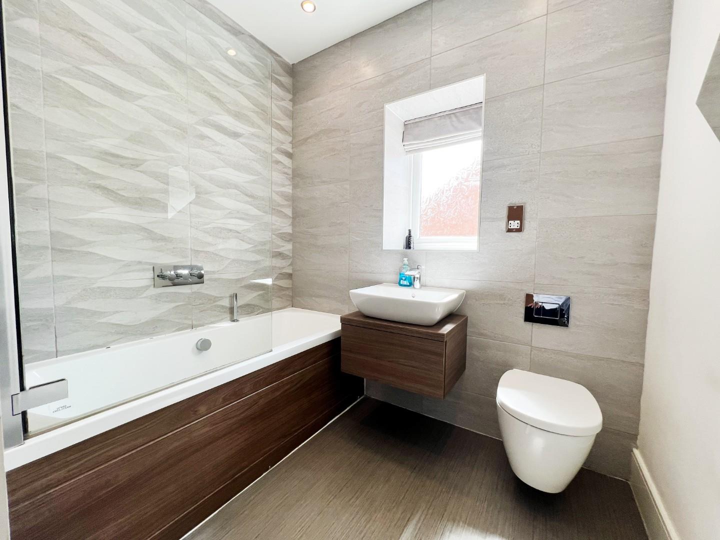 Panelled bath, wash hand basin, w/c, chrome towel radiator, uPVC window, spotlights, extractor fan.
