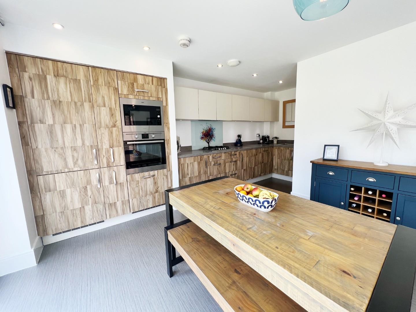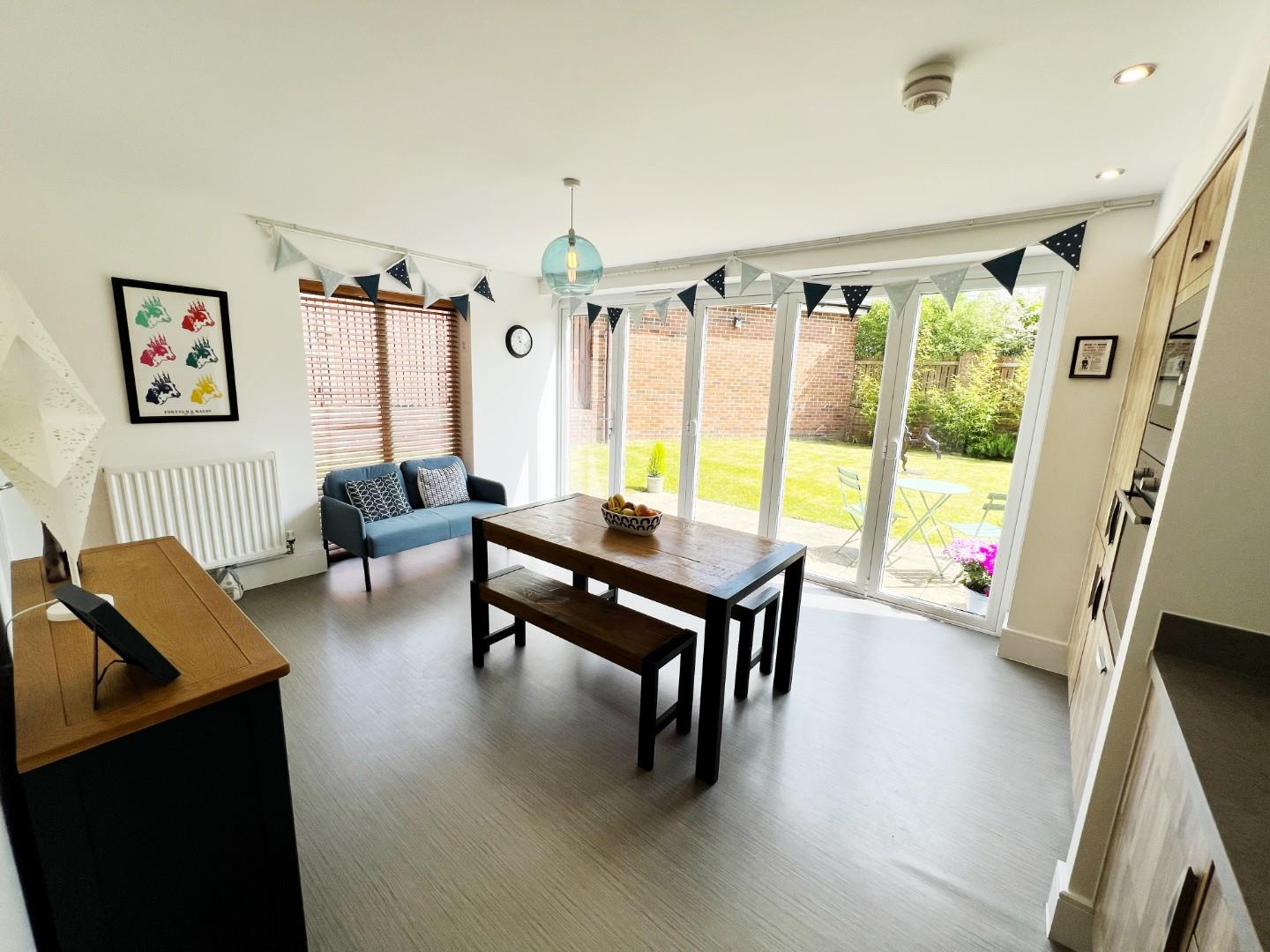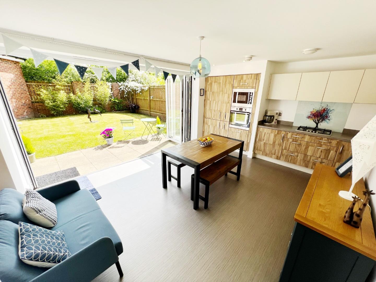 Modern wall and base units, integrated fridge freezer, oven, hob, extractor fan, dishwasher, microwave, stainless steel sink with mixer tap and drainer, uPVC window, radiator, space for dining room table, spotlights, bi-folding doors overlooking the rear garden.