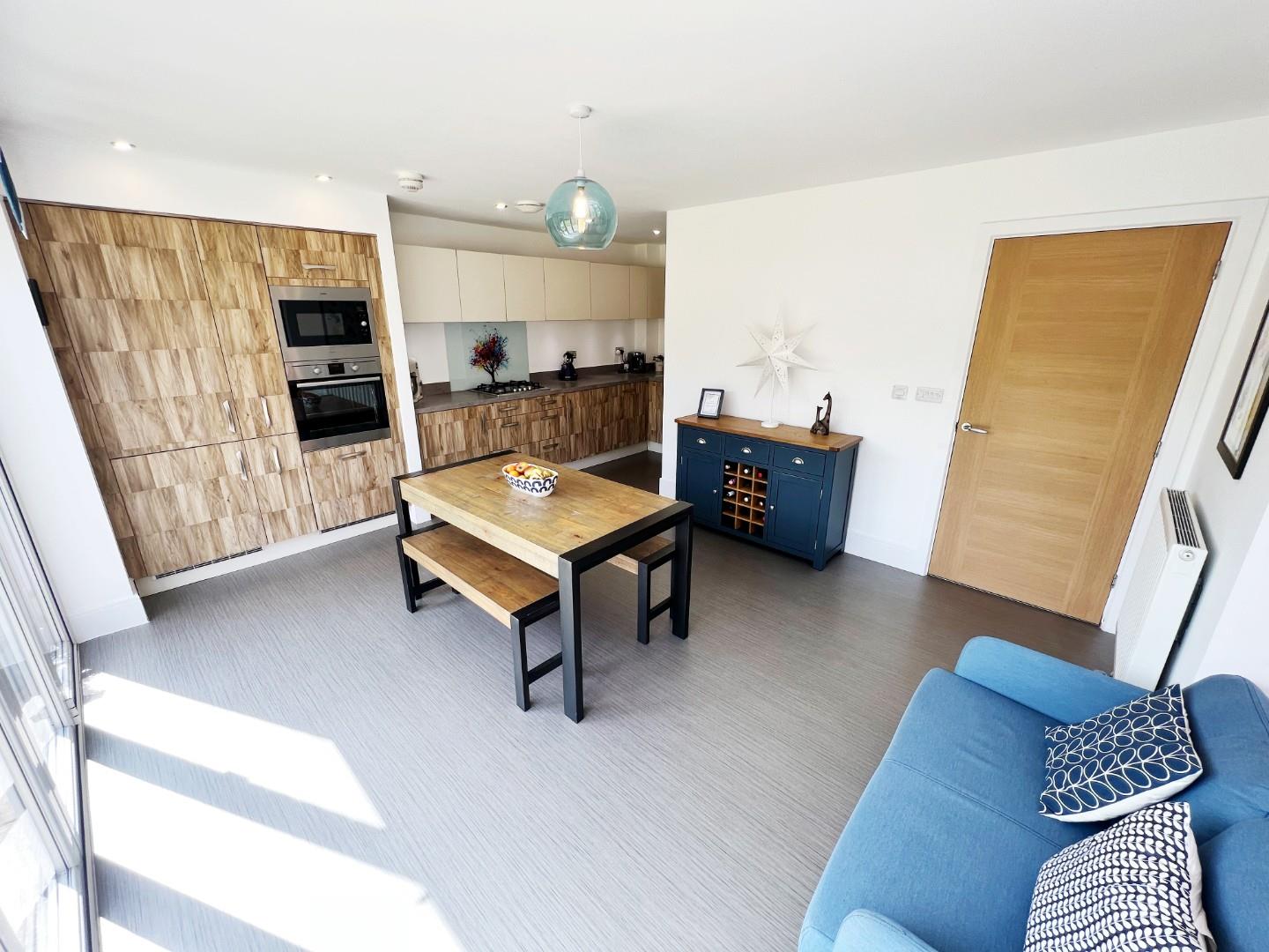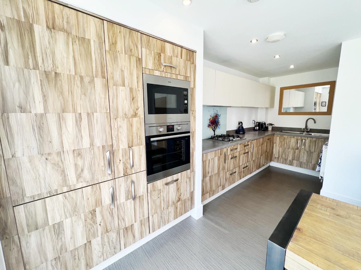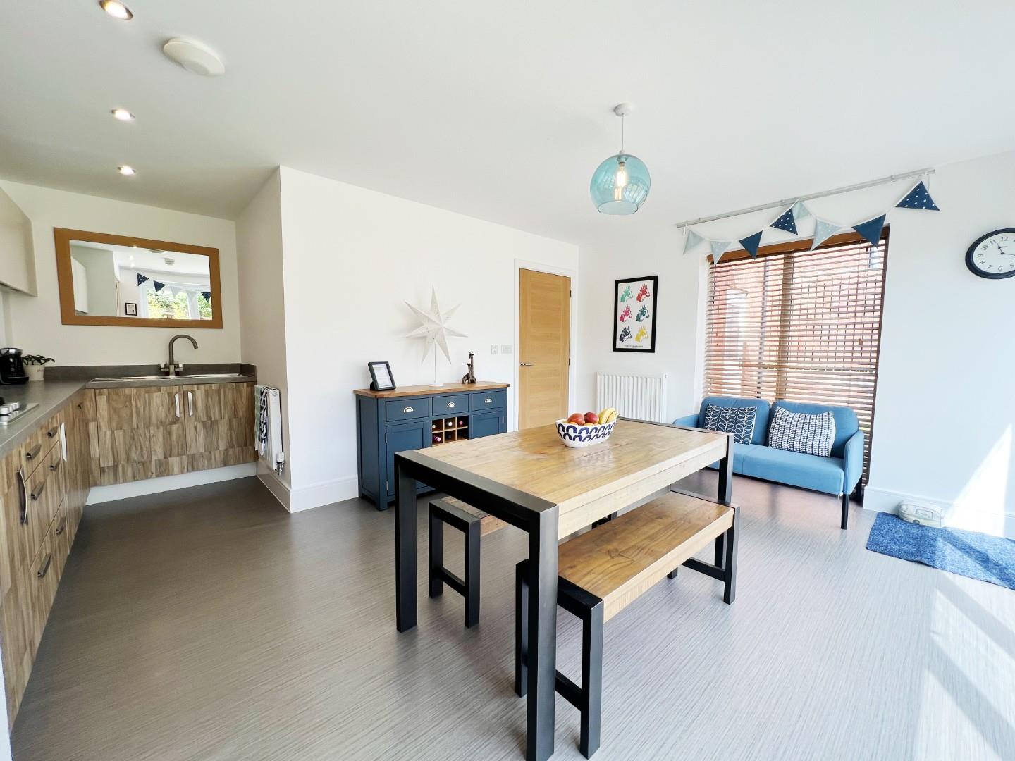 Modern wall and base units, integrated fridge freezer, oven, hob, extractor fan, dishwasher, microwave, stainless steel sink with mixer tap and drainer, uPVC window, radiator, space for dining room table, spotlights, bi-folding doors overlooking the rear garden.