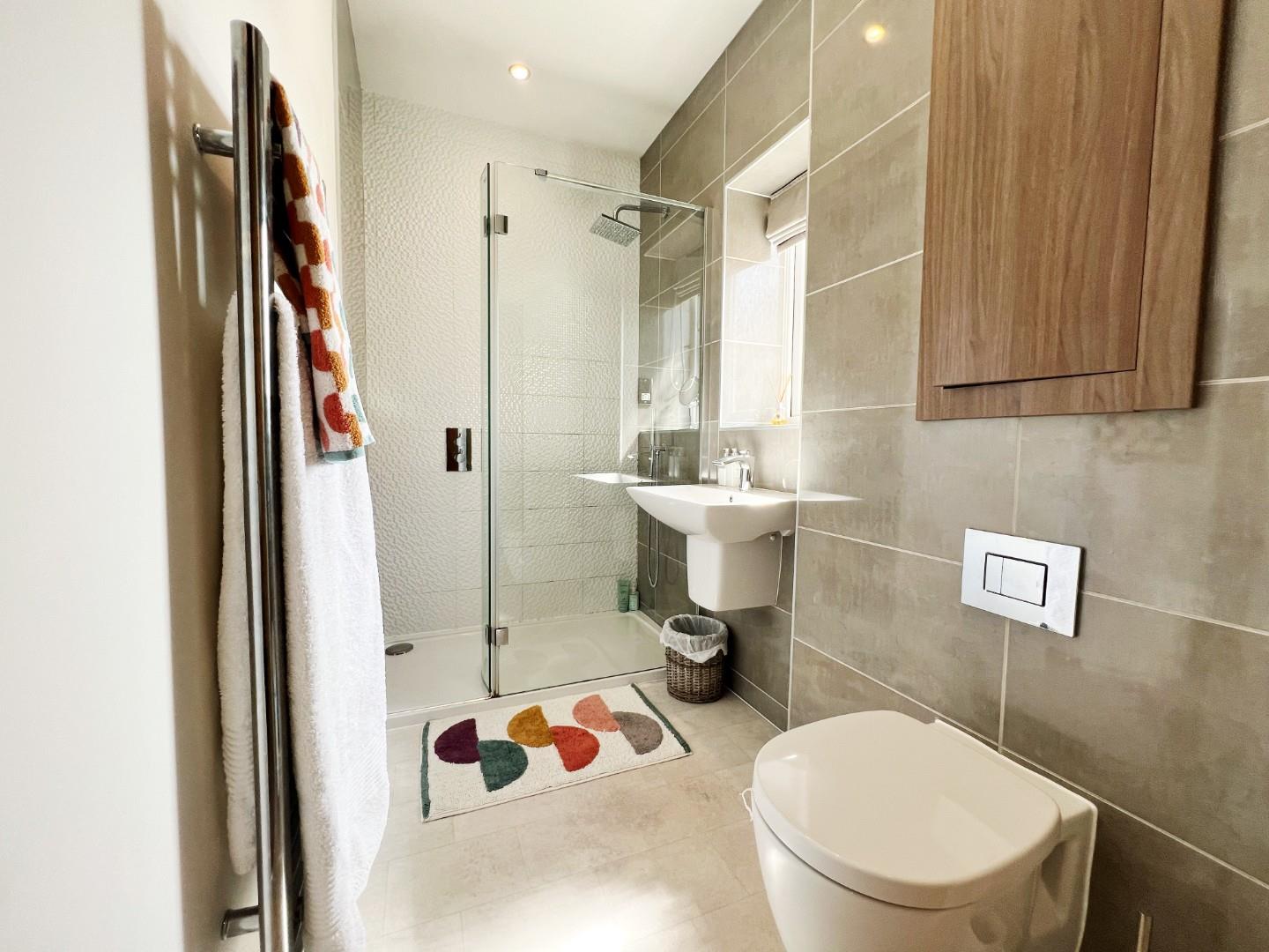 Double walk in shower, w/c, wash hand basin, chrome towel radiator, partly tiled, spotlights, extractor fan, uPVC window.