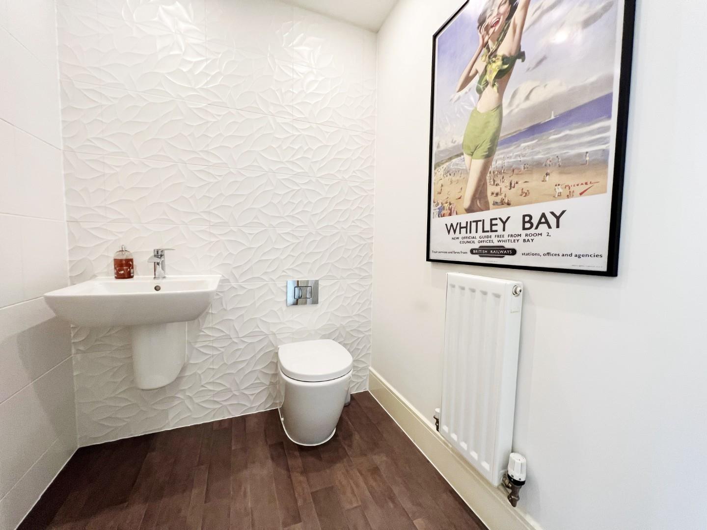 W/C, wash hand basin, tiled surround, radiator, extractor fan, spotlights, radiator.