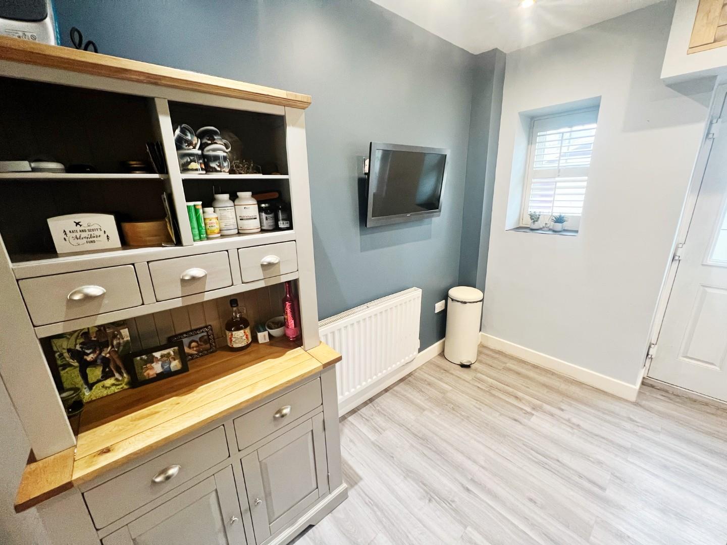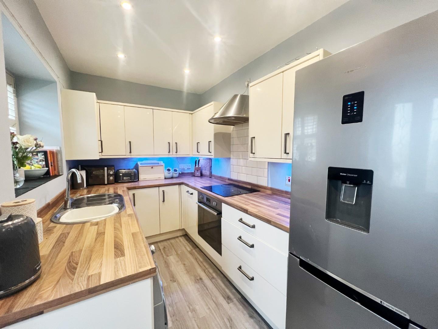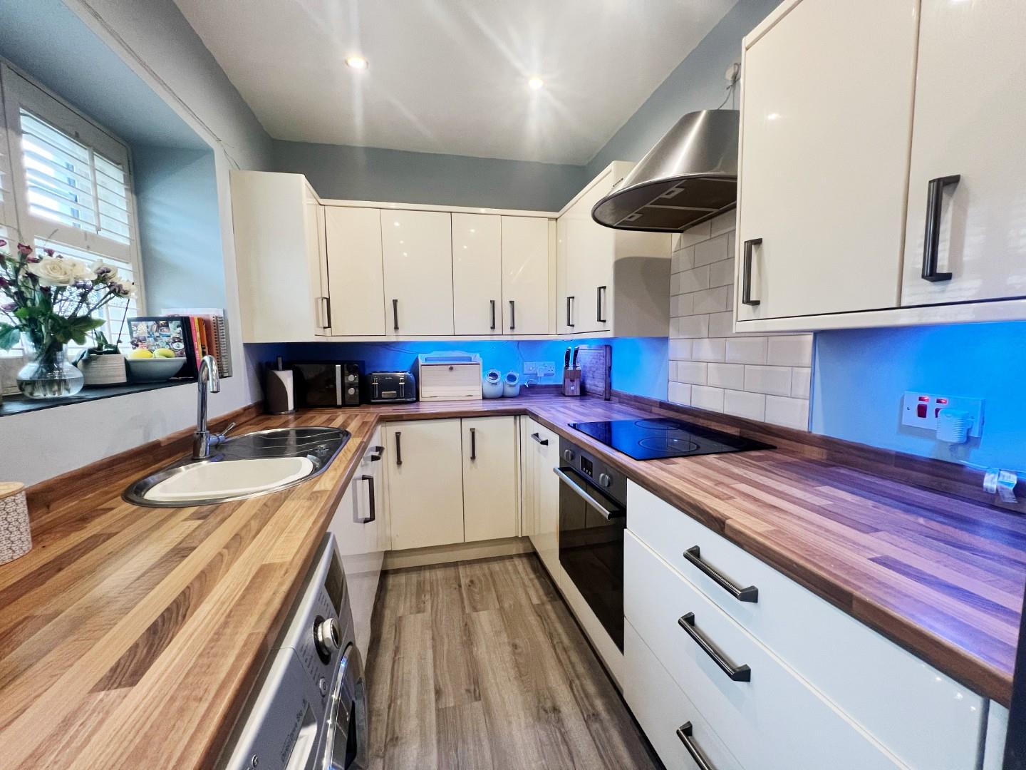Modern wall and base units, integrated oven, hob, extractor fan, dishwasher, stainless steel sink with mixer tap and drainer, uPVC window, plumbed for washing machine, radiator, uPVC window with shutter blinds, spot lights, storage cupboard.