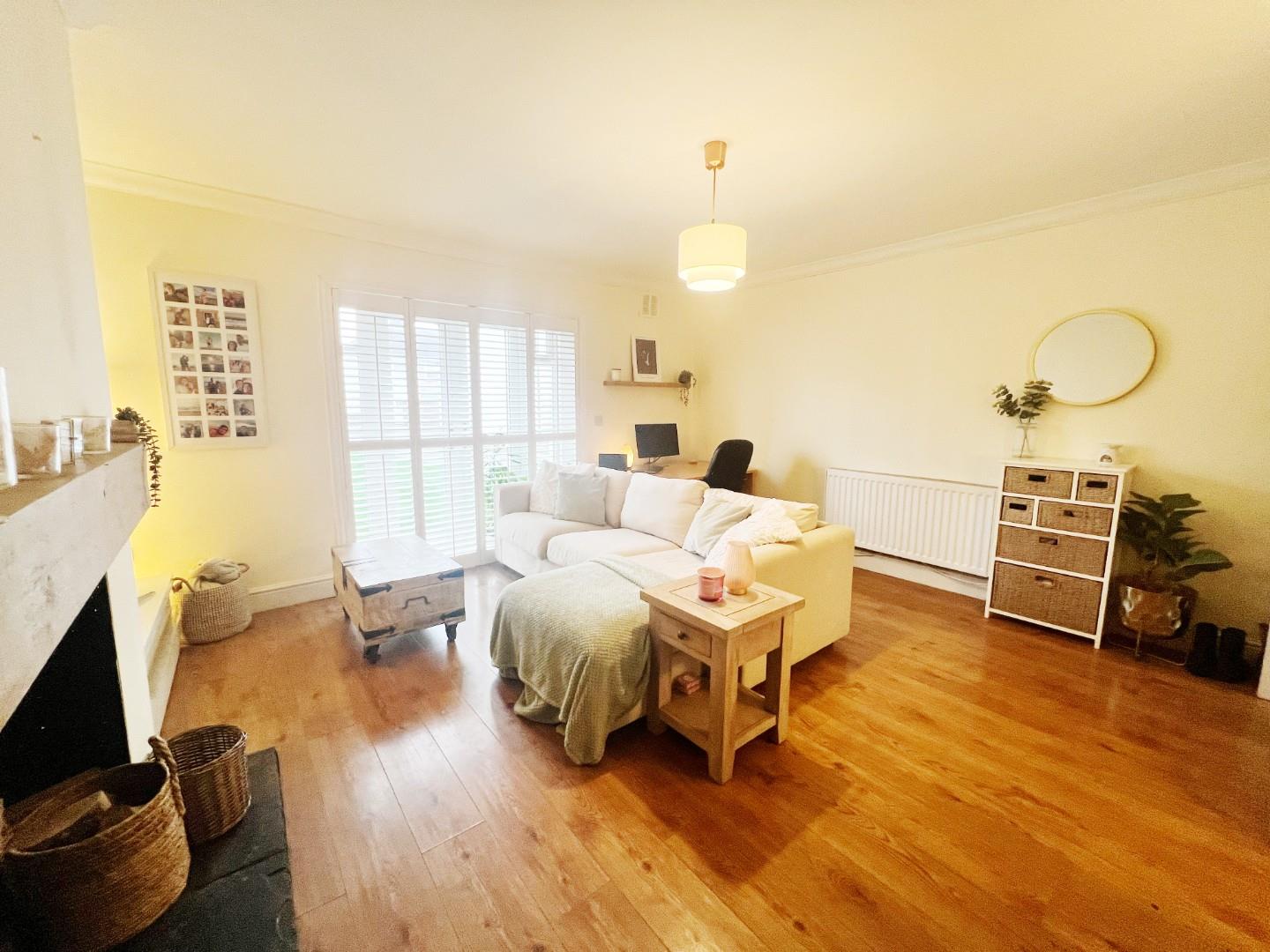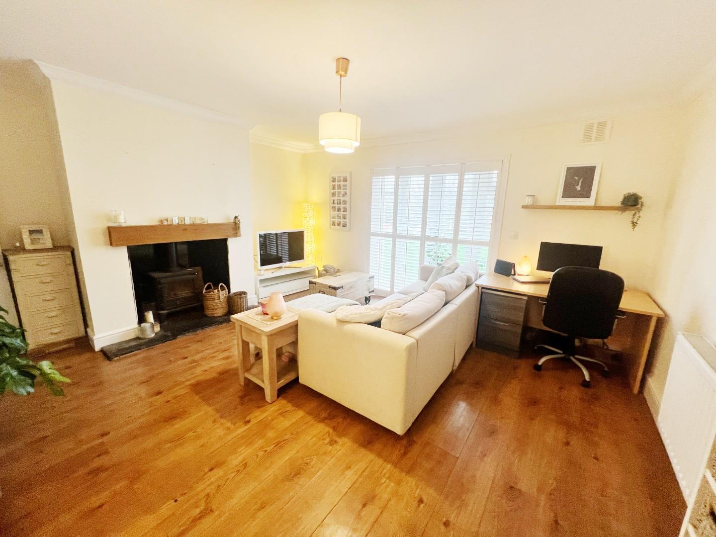 Wood effect flooring, french doors, shutter blinds, multi fuel stove, radiator.