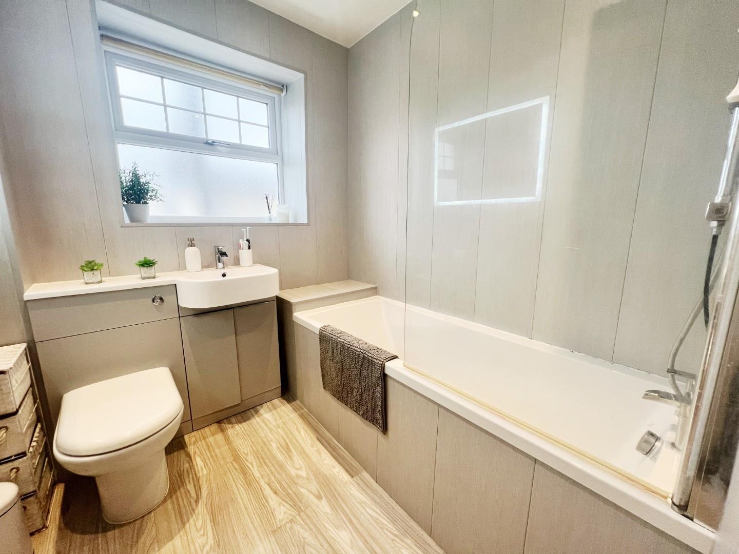 Panelled bath with shower over, wash hand basin, W/C, uPVC window, hand towel radiator, spot lights.
