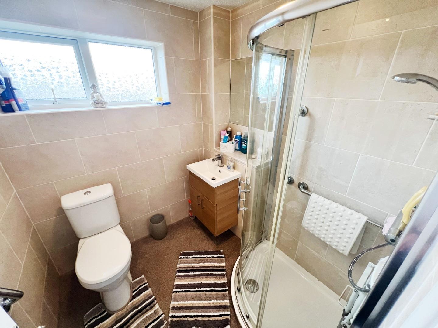 Shower cubicle, wash hand basin, uPVC window, w/c, tiled splashbacks.