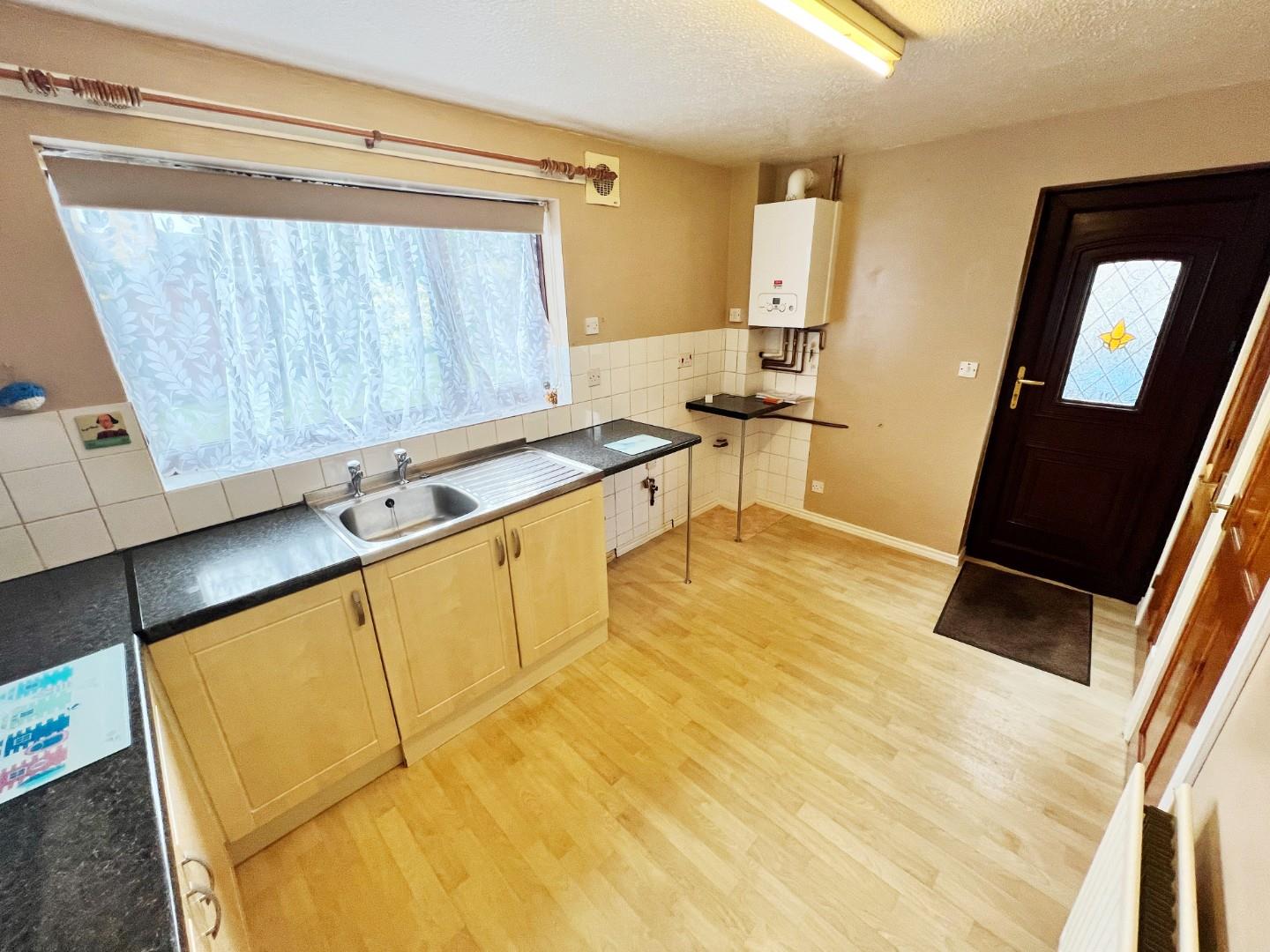 Wall and base units, stainless steel sink with drainer, gas cooker point, space for fridge freezer, plumbed for washing machine, wood effect flooring, large storage cupboard, radiator, uPVC window, tiled splashbacks.