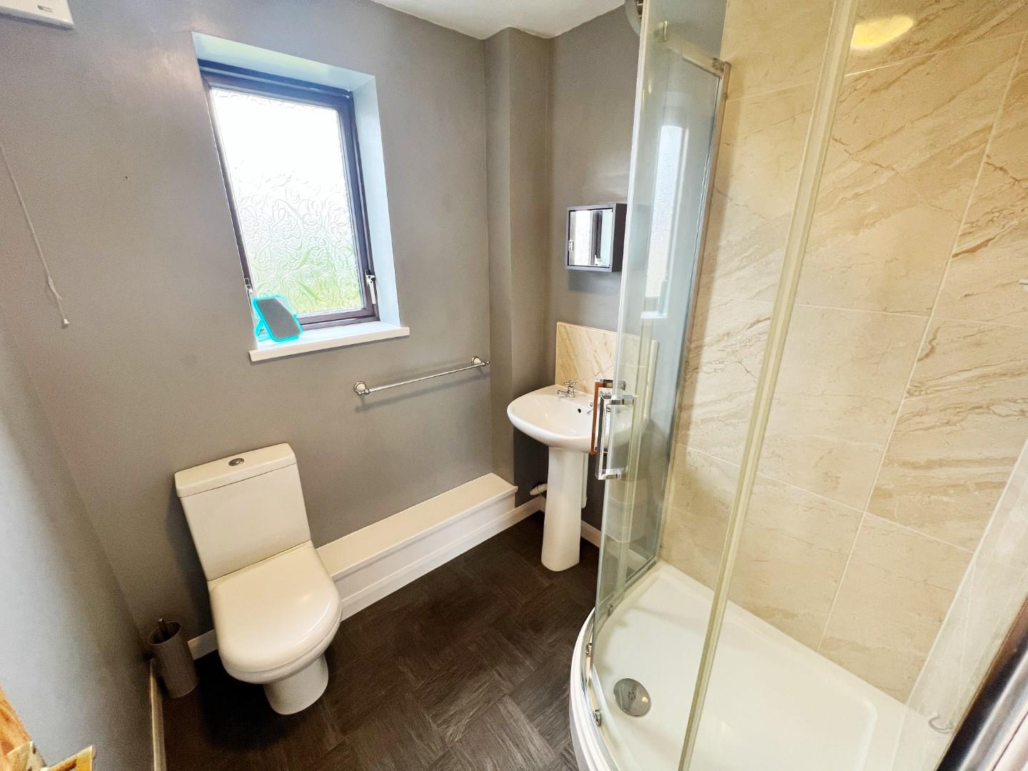 Shower cubicle, wash hand basin, W/C, uPVC window, extractor fan.