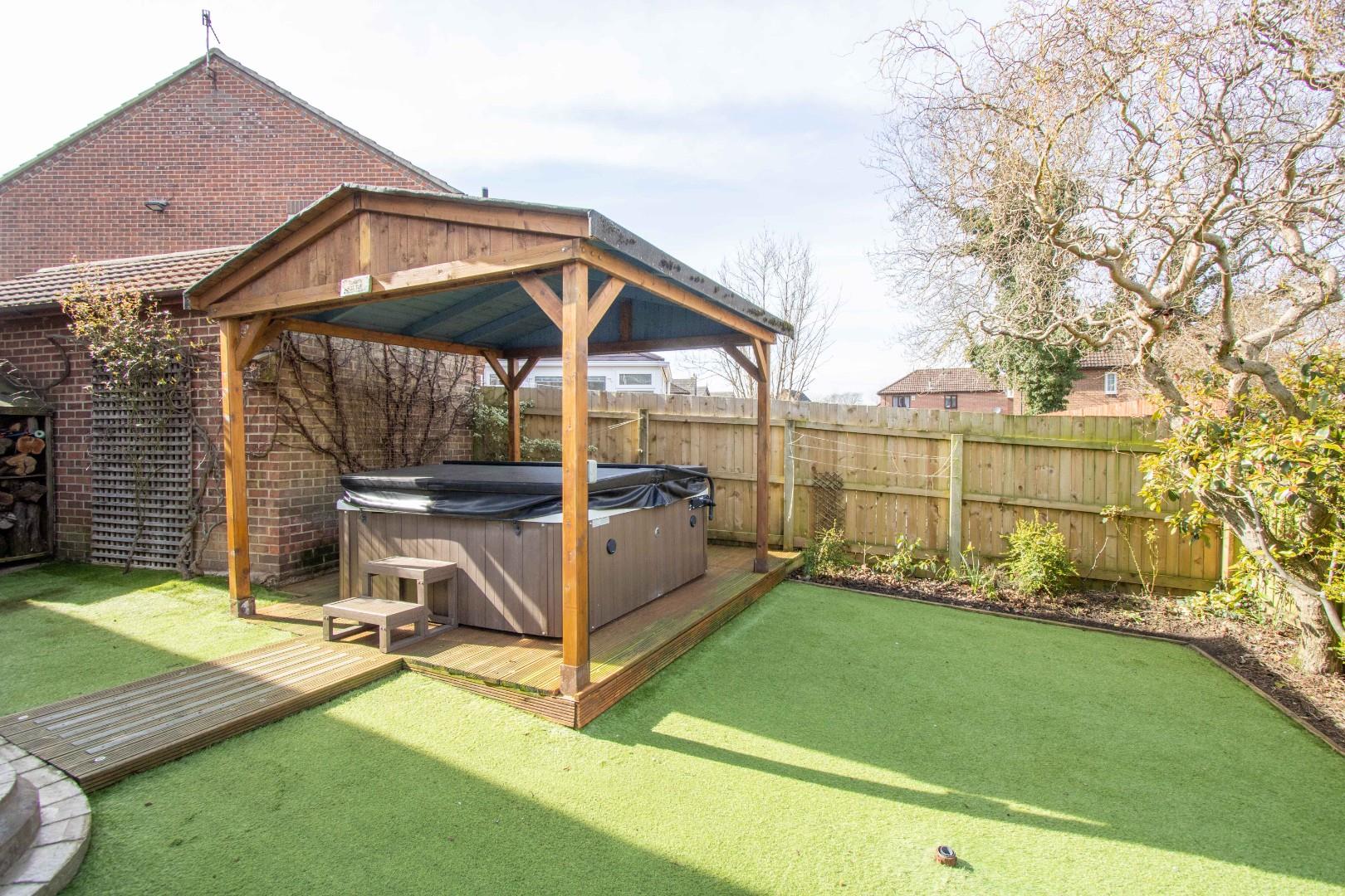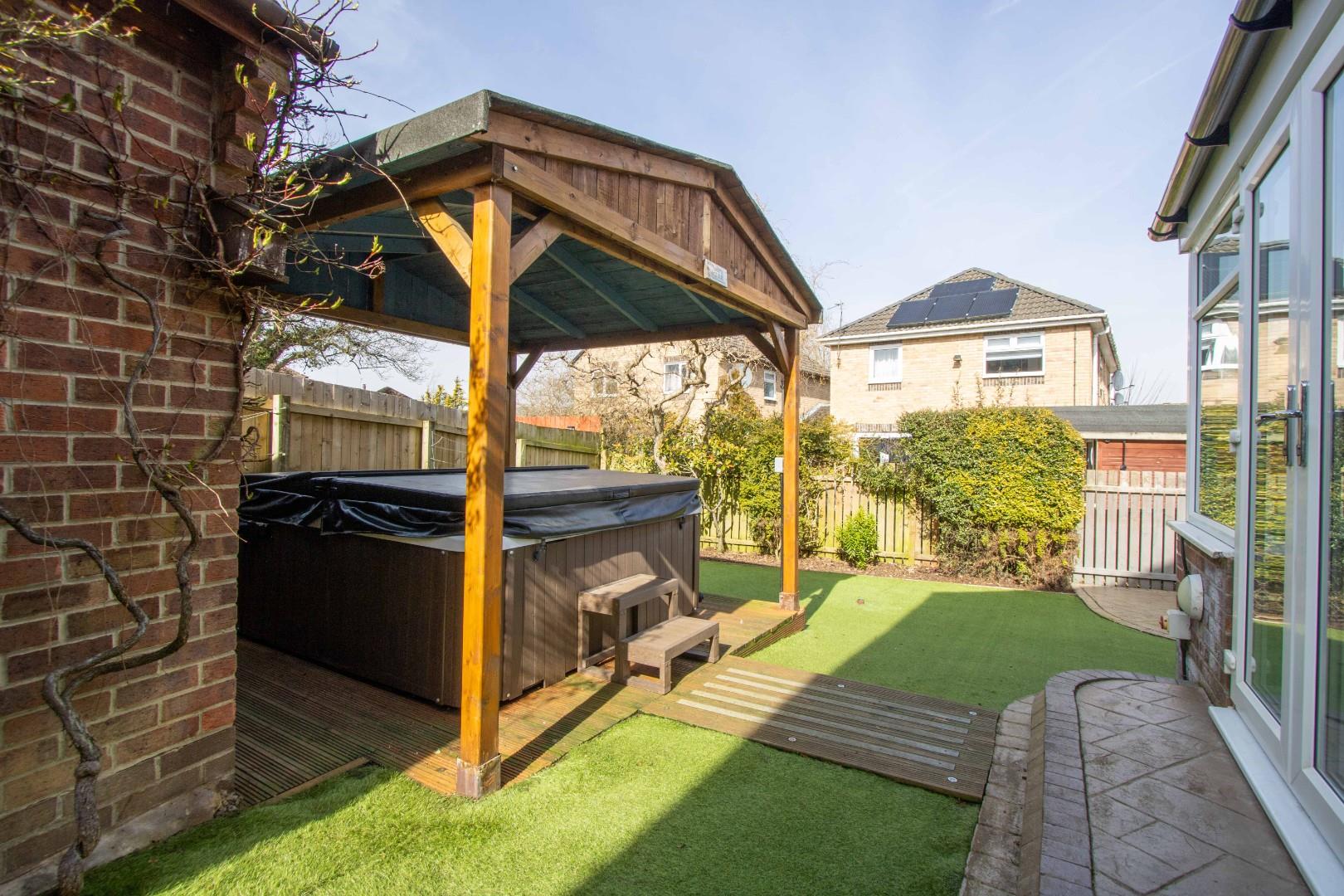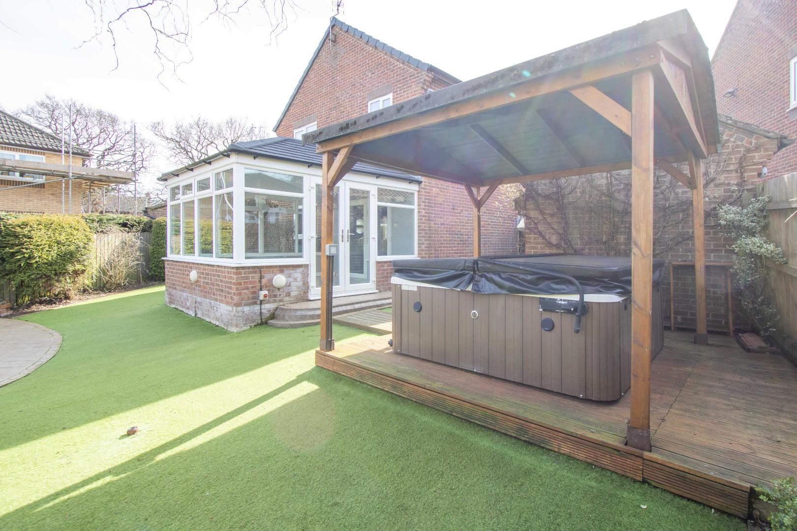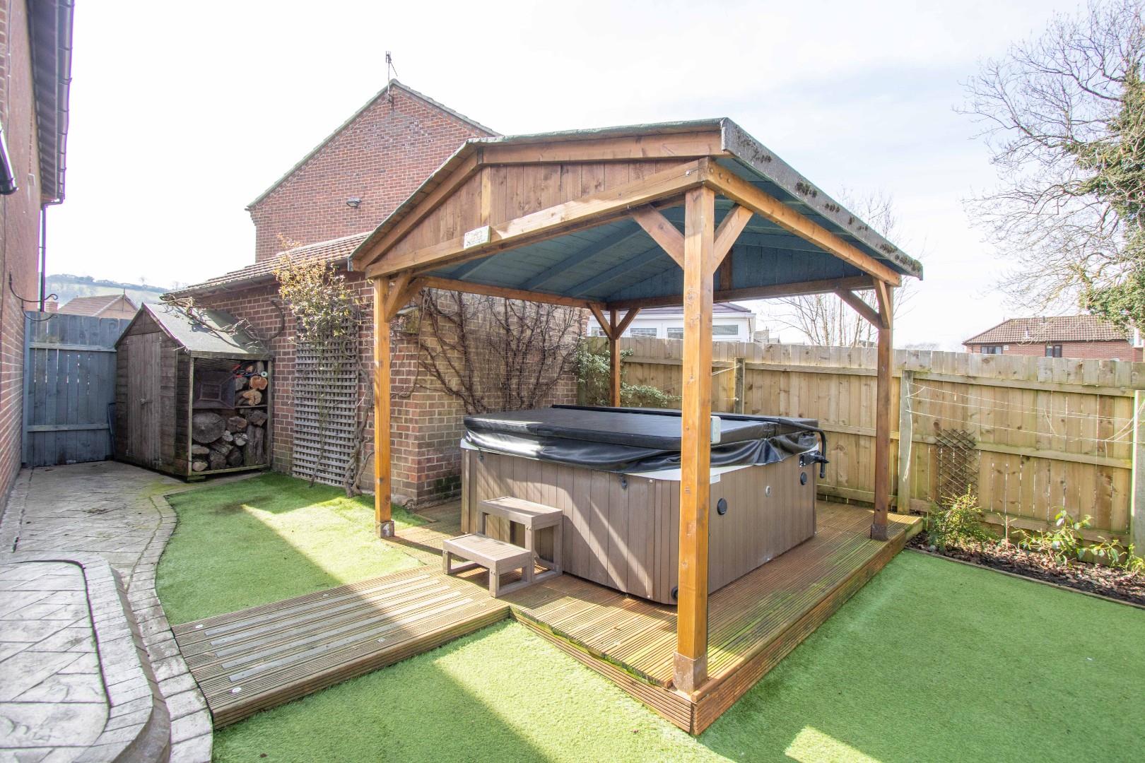 Externally, the front of the property boasts a driveway with ample space for multiple vehicles and access to the detached double garage. The rear garden is generously sized, extending to both sides of the property, and is designed for easy maintenance. It also features a dedicated hot tub area, with the hot tub potentially included in the sale.