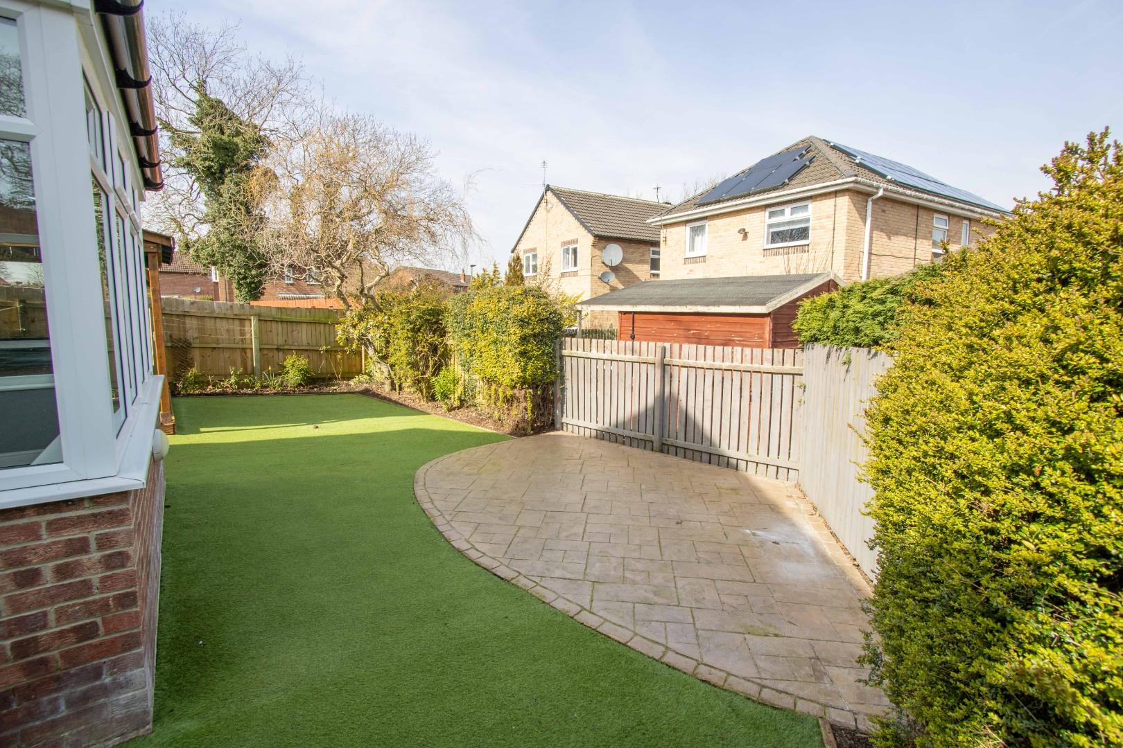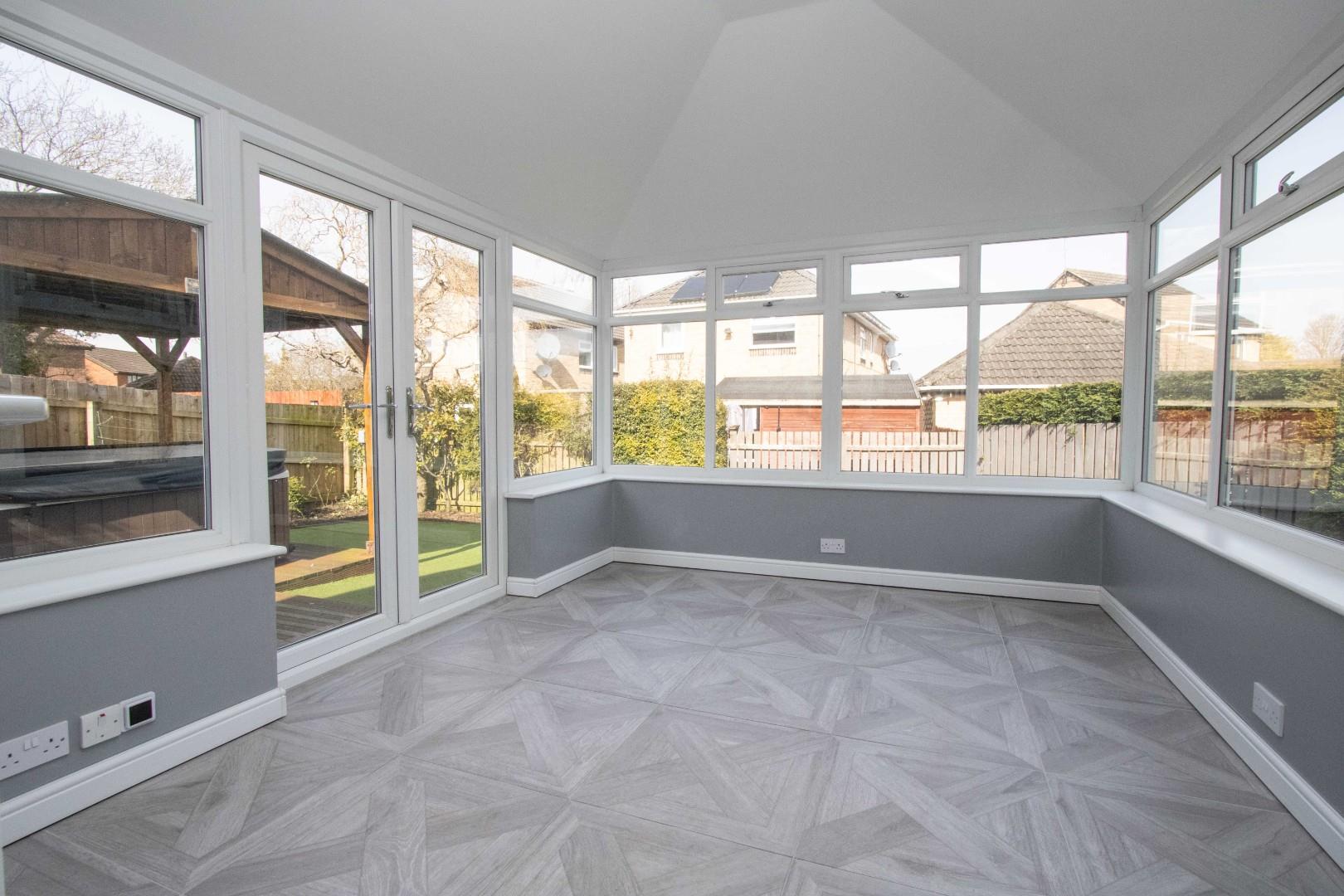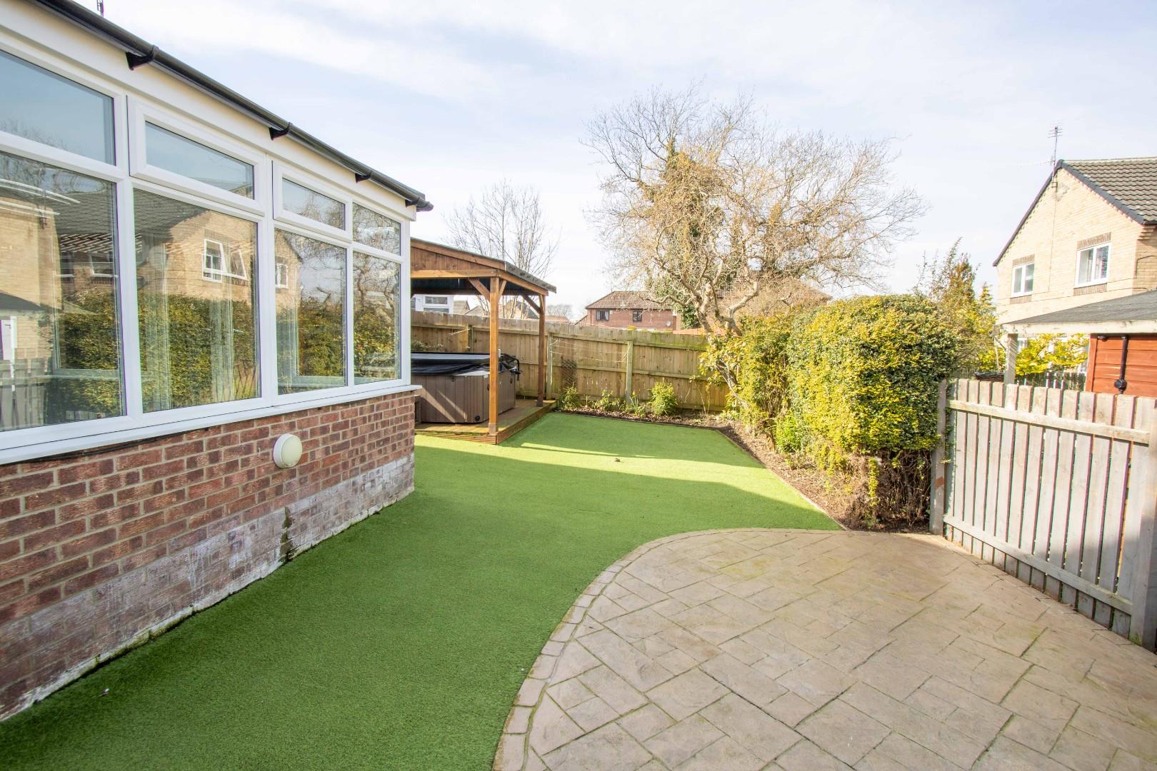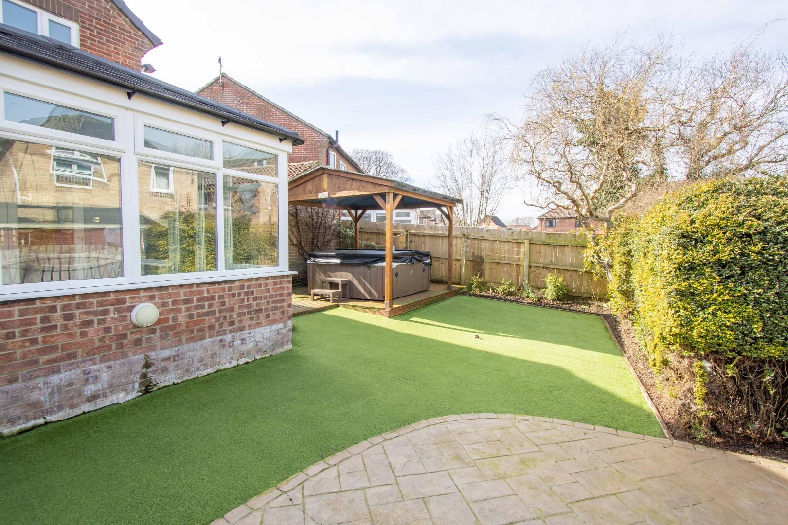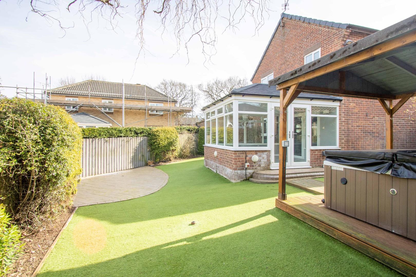 Externally, the front of the property boasts a driveway with ample space for multiple vehicles and access to the detached double garage. The rear garden is generously sized, extending to both sides of the property, and is designed for easy maintenance. It also features a dedicated hot tub area, with the hot tub potentially included in the sale.
