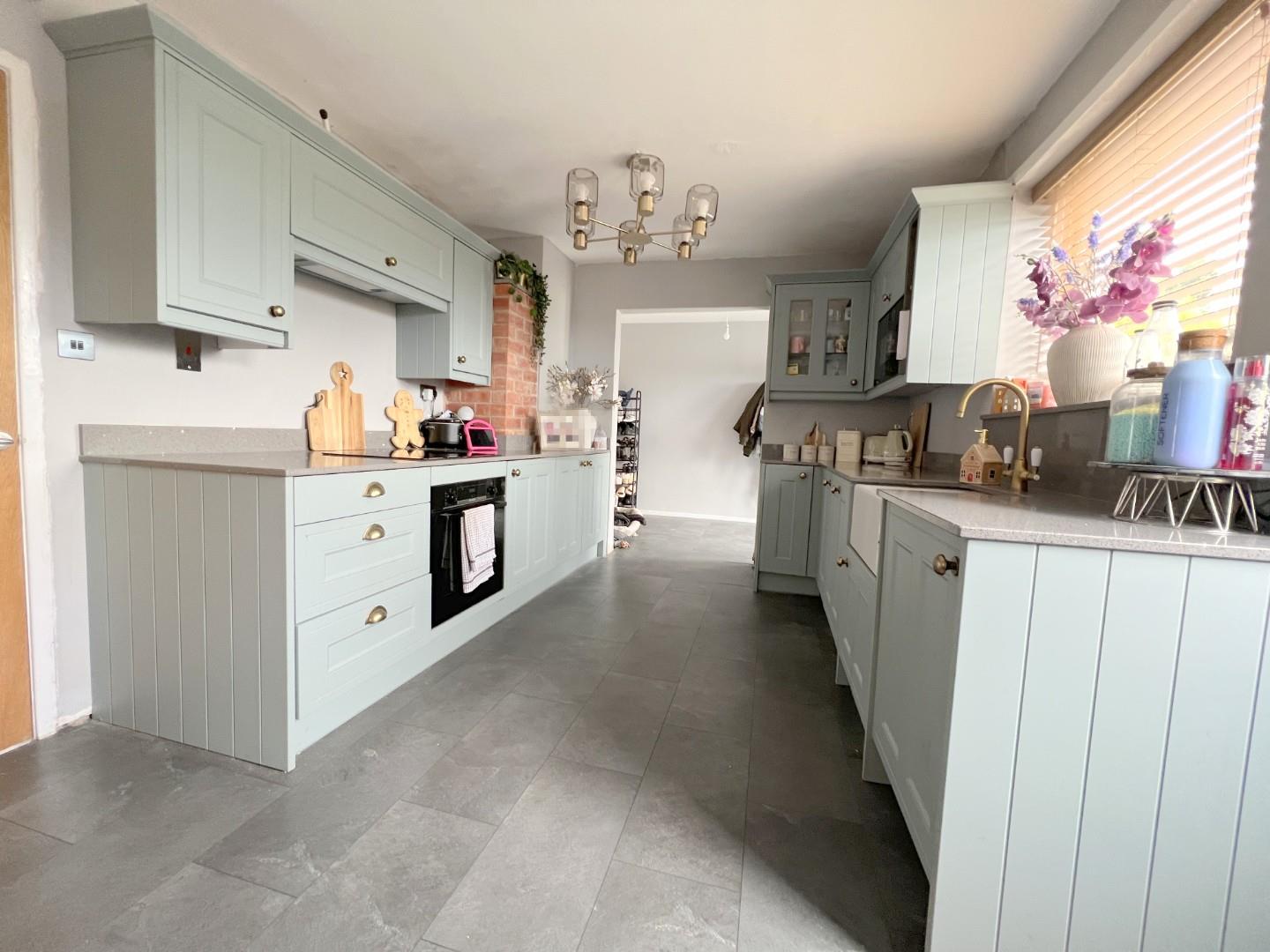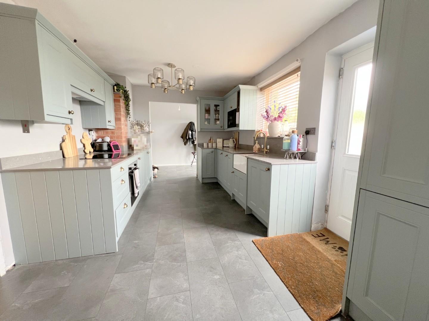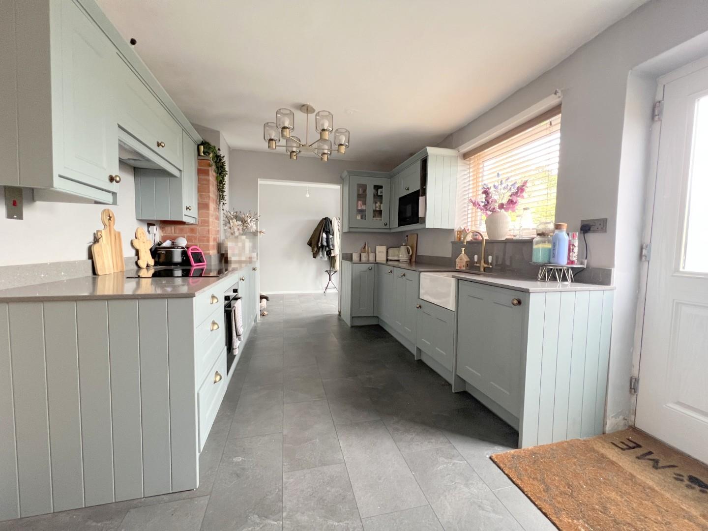 The internal floorplan comprises a hallway, downstairs WC, well-sized lounge with log burner, and a stunning kitchen with ample wall and base units, a Belfast-style sink, and space for a dining table.