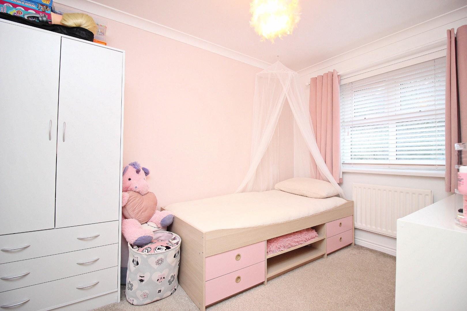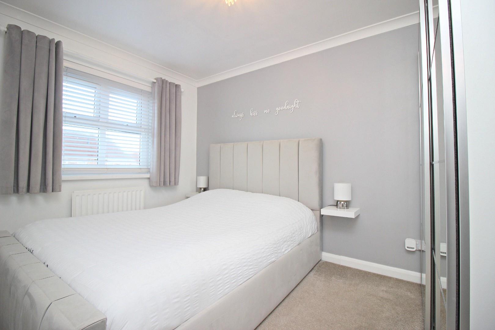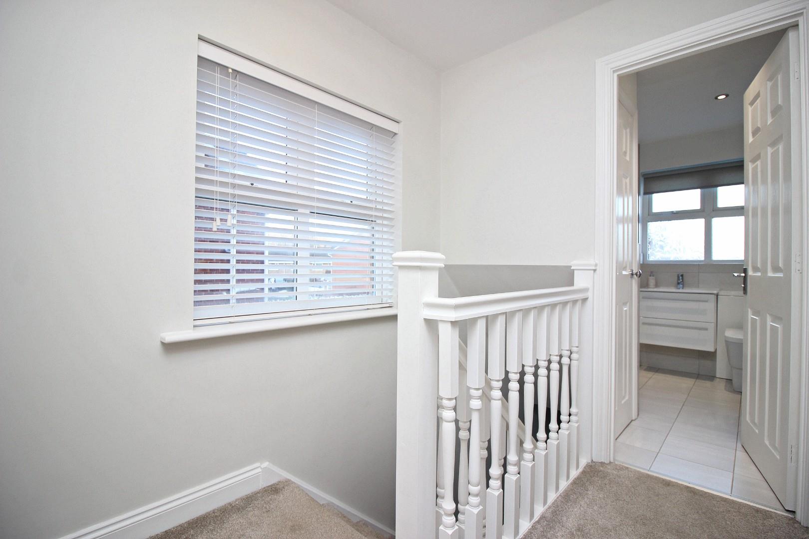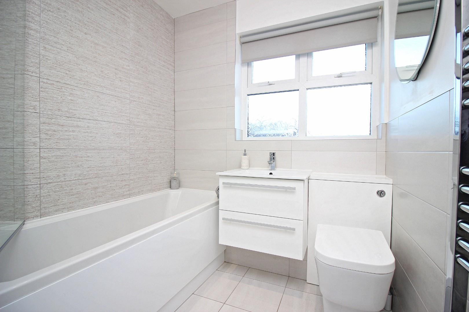 Upstairs are three well-proportioned bedrooms, each thoughtfully finished with coving and ample natural light. The luxurious bathroom features a panelled bath with shower over, a vanity unit with storage, a housed WC, and elegant tiling.