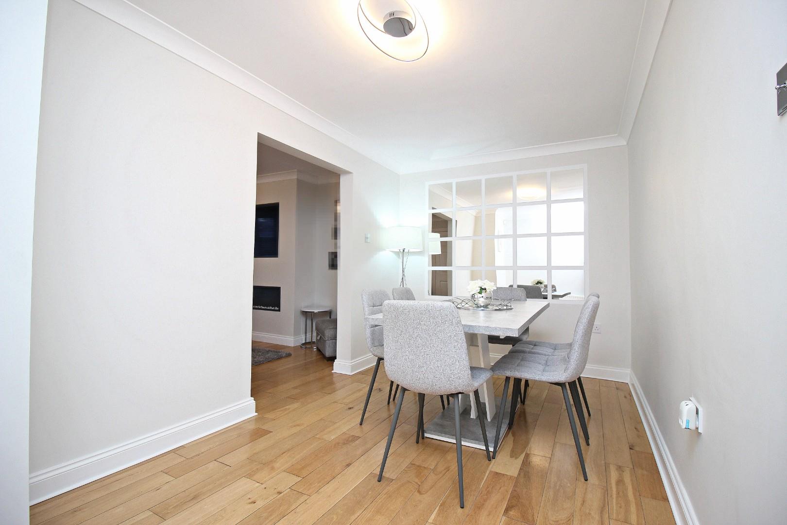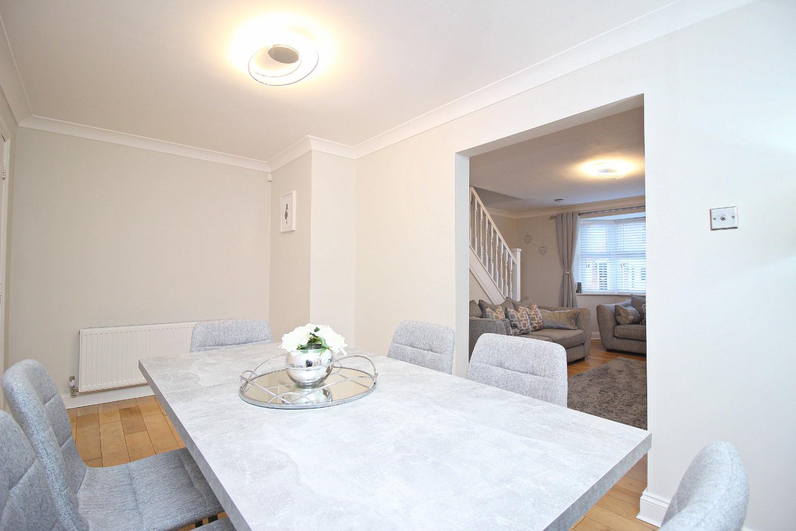 Upon entering, the vestibule with laminate flooring and a storage cupboard leads into the spacious open-plan lounge. Featuring a stylish fire and cinema wall, a large bay window, and a spindled staircase, this area is bright and welcoming with solid wood flooring adding a touch of elegance. The separate dining area offers an ideal space for entertaining or family meals.