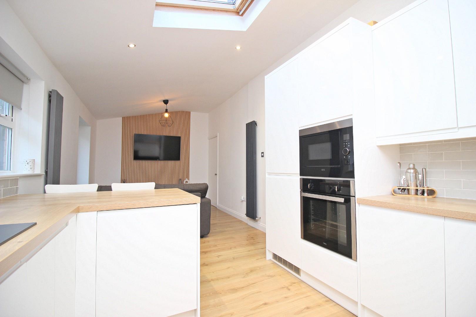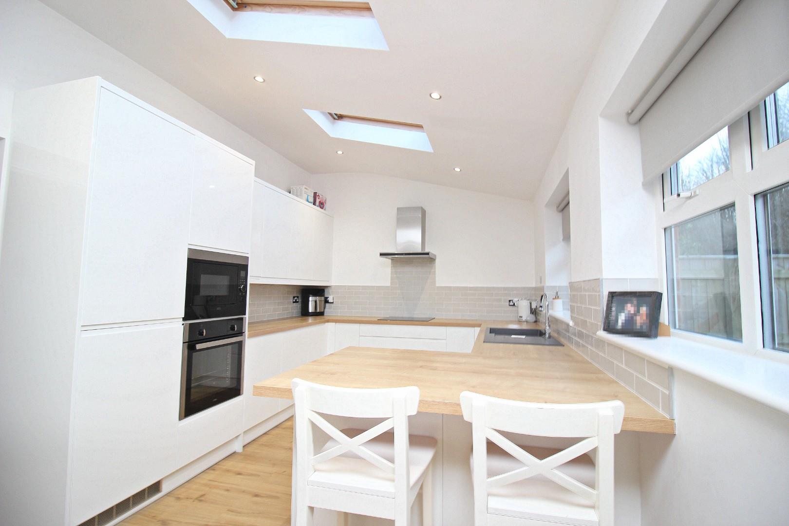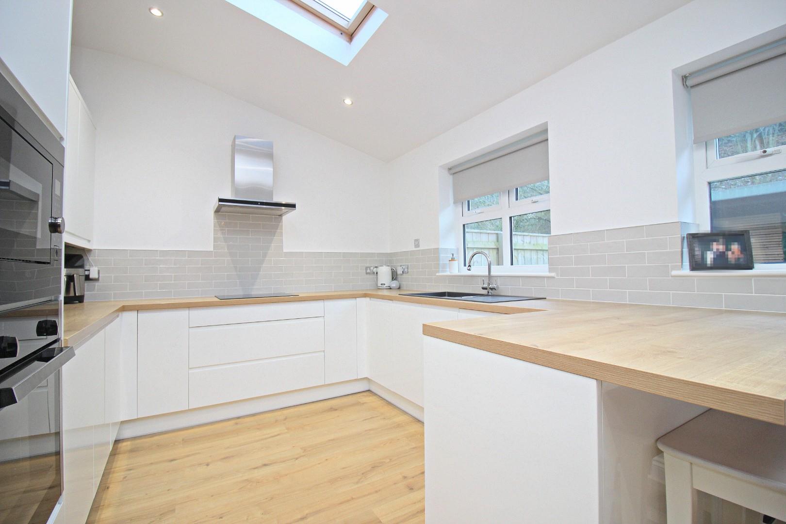The highlight of this home is the superbly fitted kitchen/family room. Boasting sleek white units, wood-effect worktops, and integrated appliances, including a hob, oven, microwave, fridge-freezer, and dishwasher, this space is both functional and stylish. Velux windows and French doors flood the area with natural light, creating a seamless flow to the rear garden. A separate utility area/small garage provides additional storage and plumbing for a washing machine.