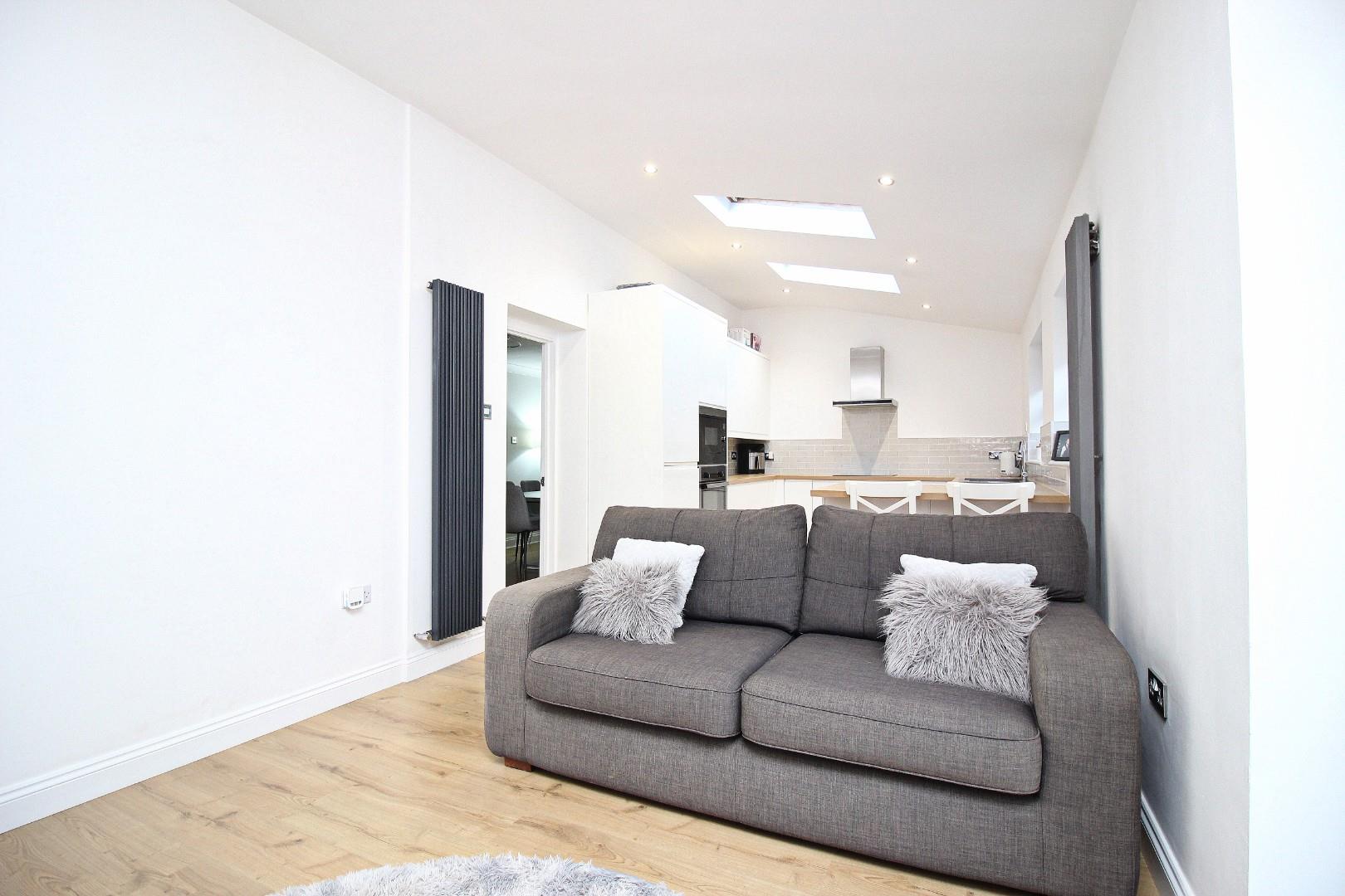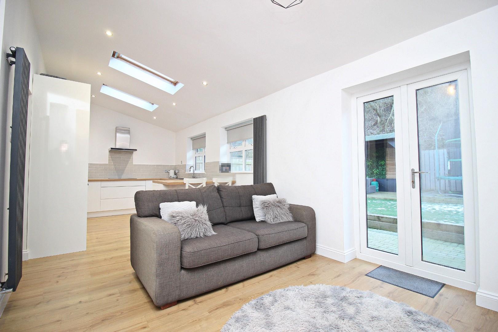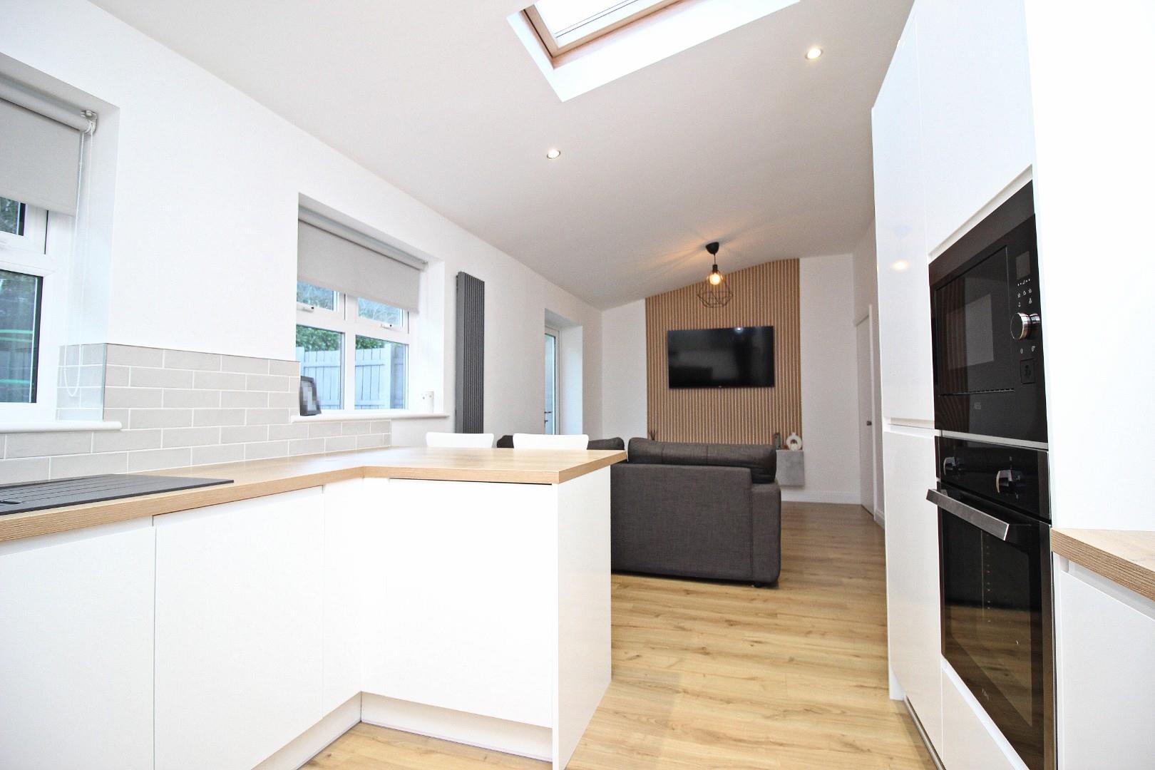 The highlight of this home is the superbly fitted kitchen/family room. Boasting sleek white units, wood-effect worktops, and integrated appliances, including a hob, oven, microwave, fridge-freezer, and dishwasher, this space is both functional and stylish. Velux windows and French doors flood the area with natural light, creating a seamless flow to the rear garden. A separate utility area/small garage provides additional storage and plumbing for a washing machine.