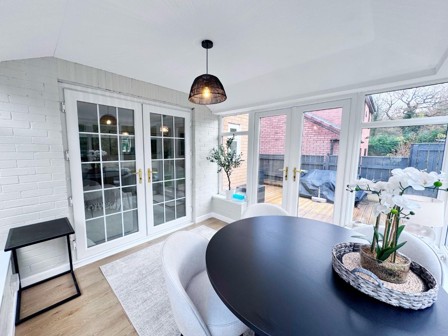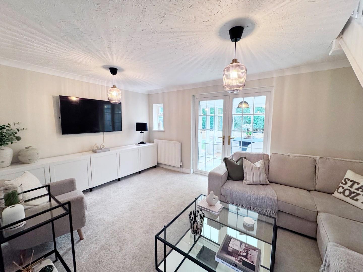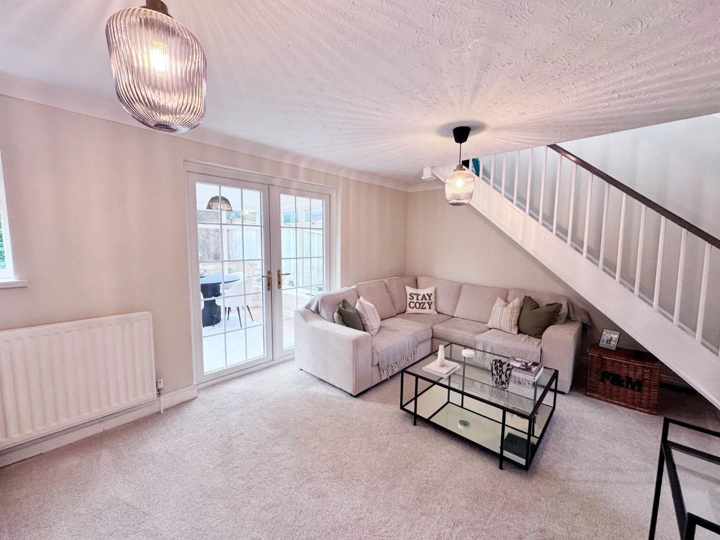 Double glazed french style doors leading to the spacious conservatory, two radiators, TV point, telephone point, coved ceiling, space for small table and chairs, stairs leading to first floor, quality flooring.