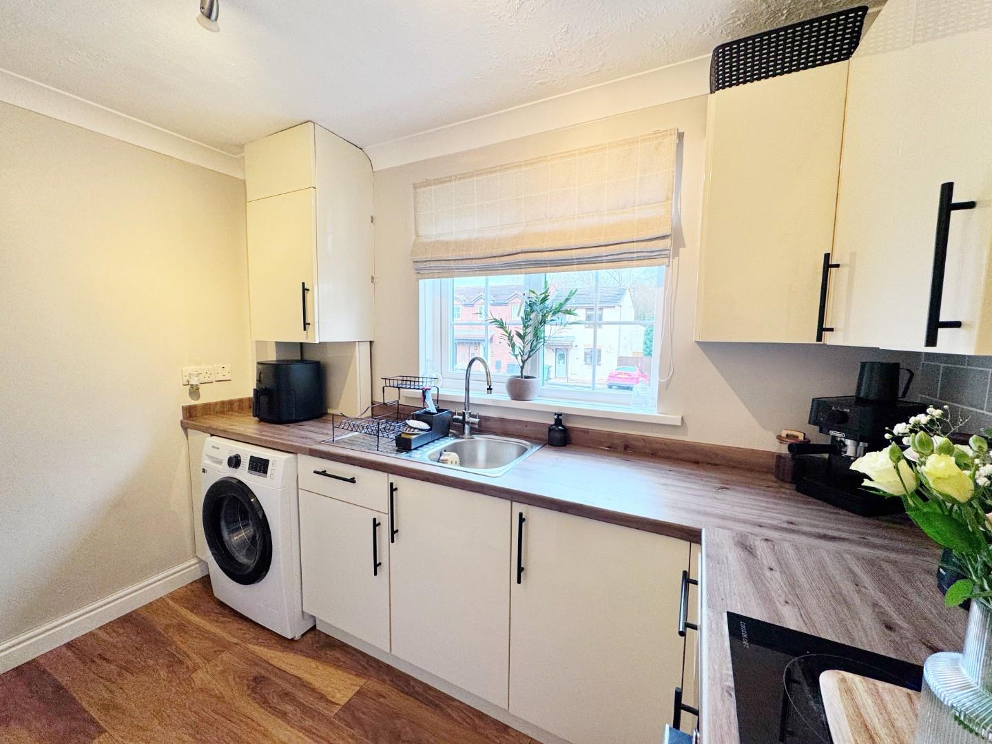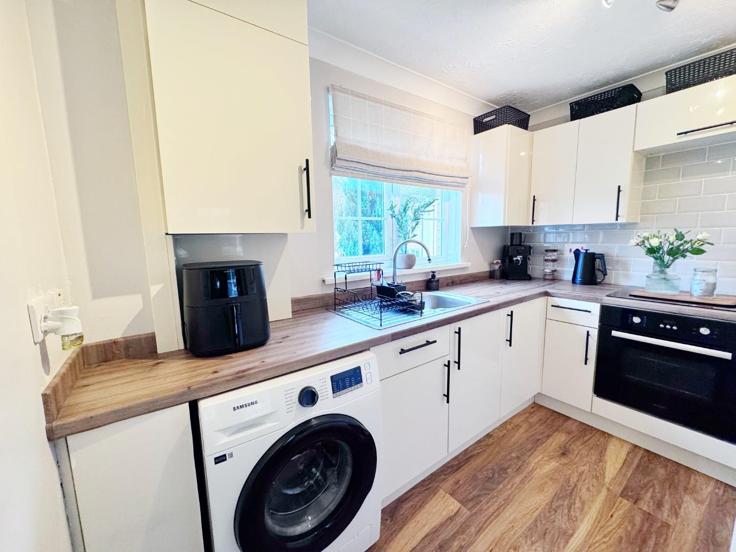 Fitted with a modern range of wall and base units with work contrasting worktops, stainless steel sink unit with mixer tap, plumbing for washing machine, electric hob and oven, tiled splashbacks, radiator, space for small dining room table, double glazed window to the front.