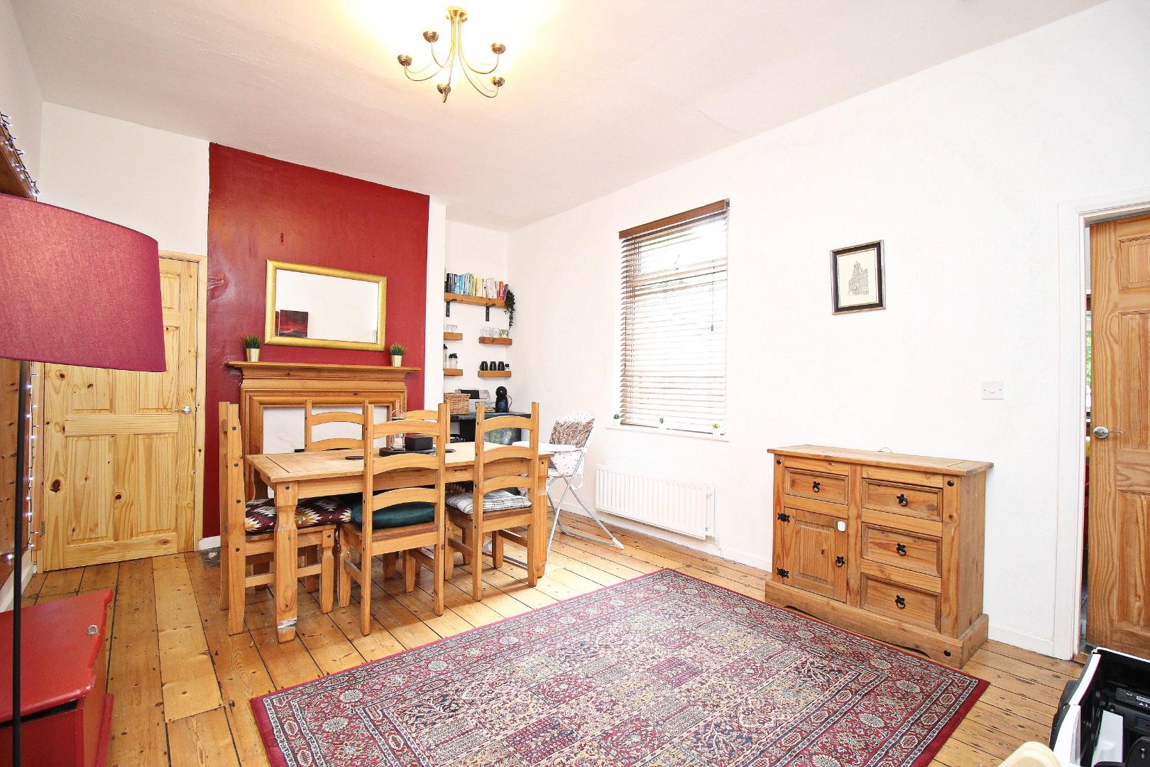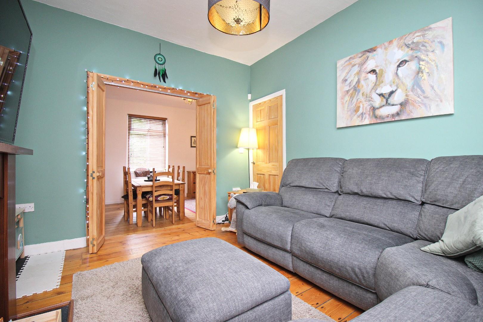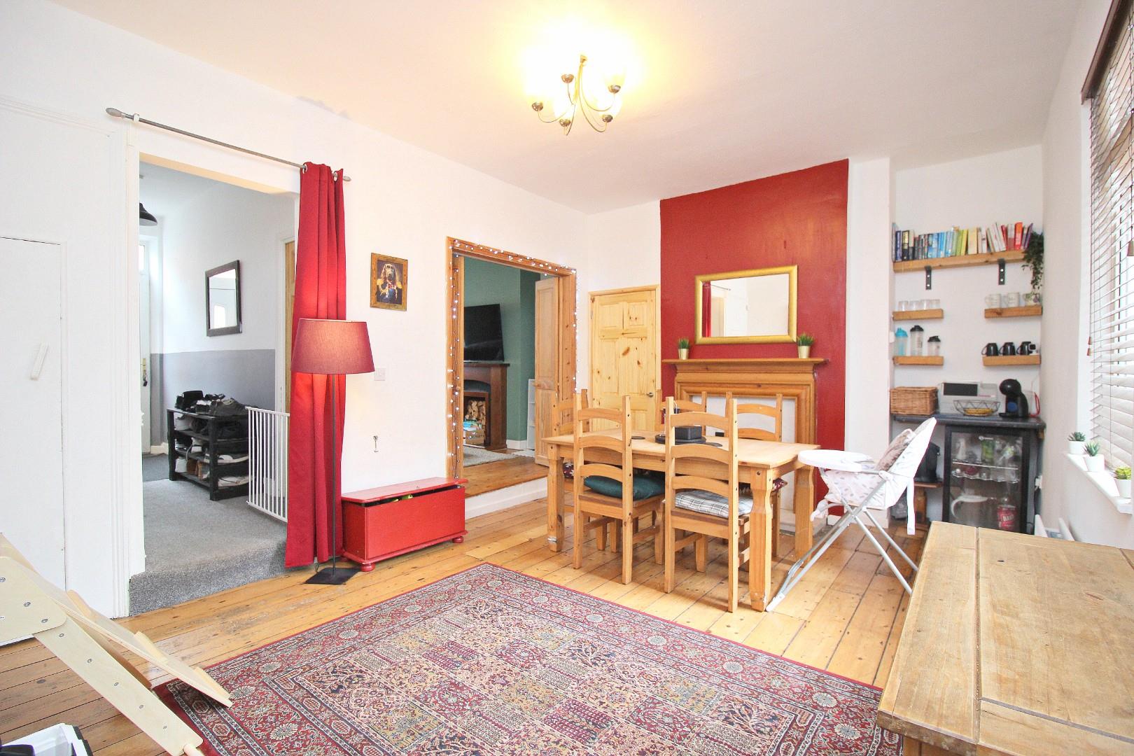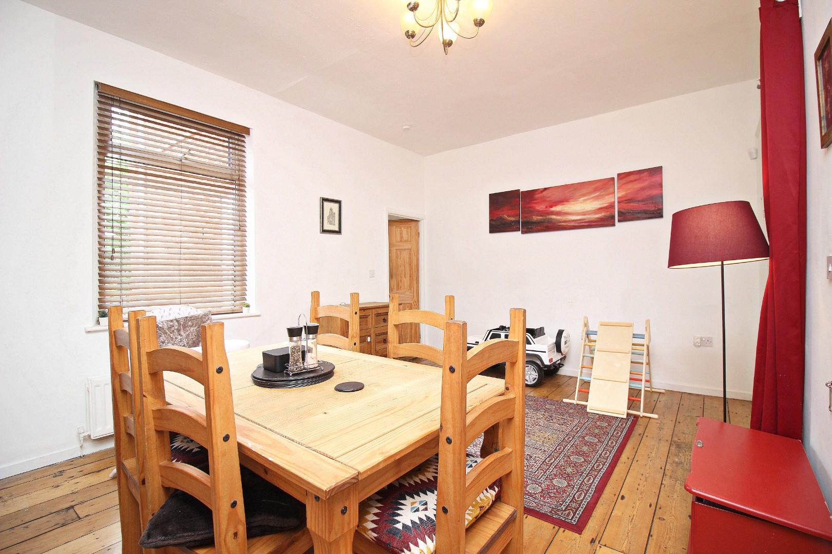 Inside, the entrance hallway includes a window and useful understairs storage with a sliding door – perfect for additional storage or even as a spot for pet beds. The front lounge is comfortable and welcoming, with doors opening into a large dining area that offers plenty of flexibility, whether you want a formal dining space, second sitting room, or even a workspace. To the rear is a well-kept kitchen.