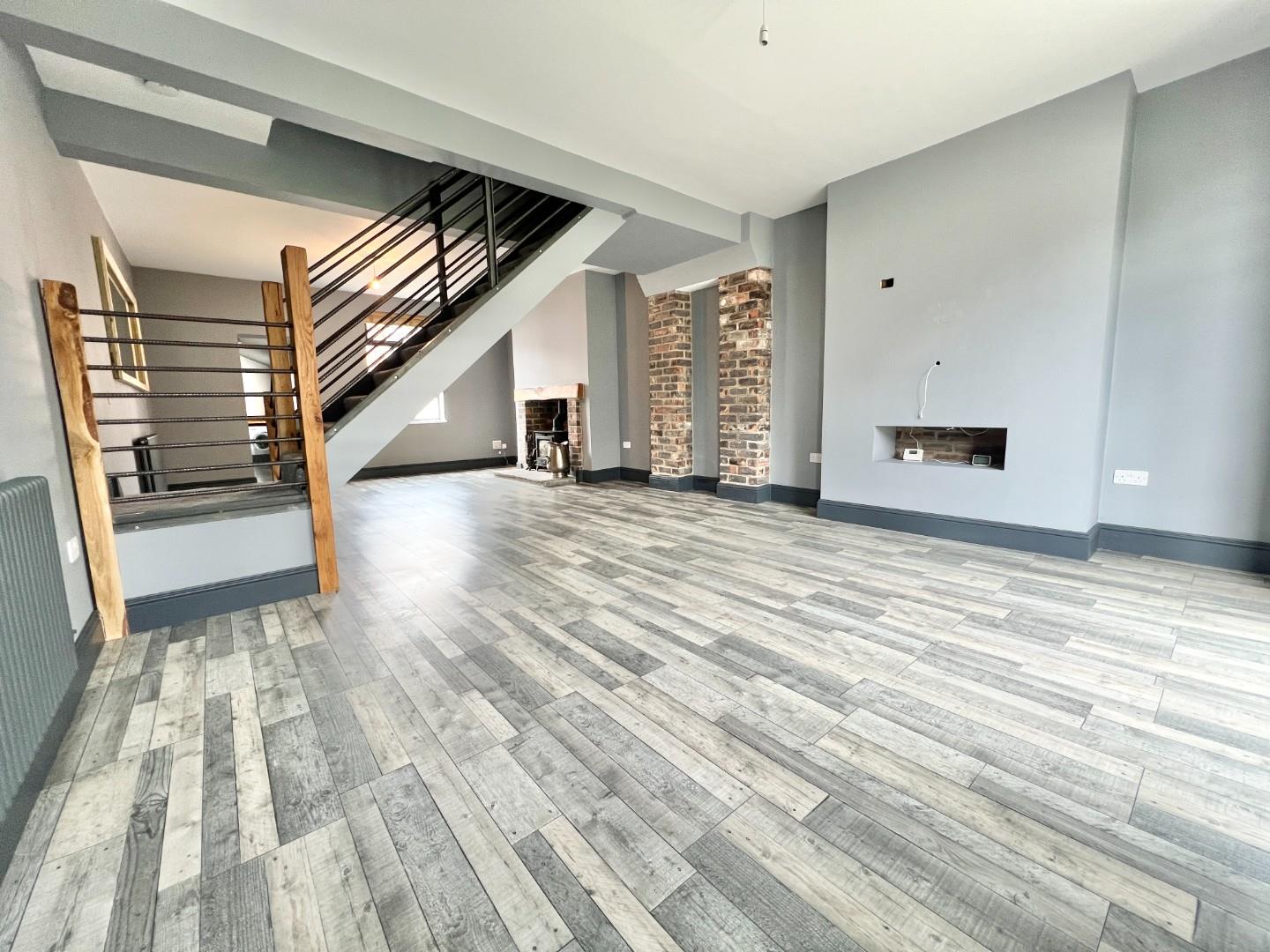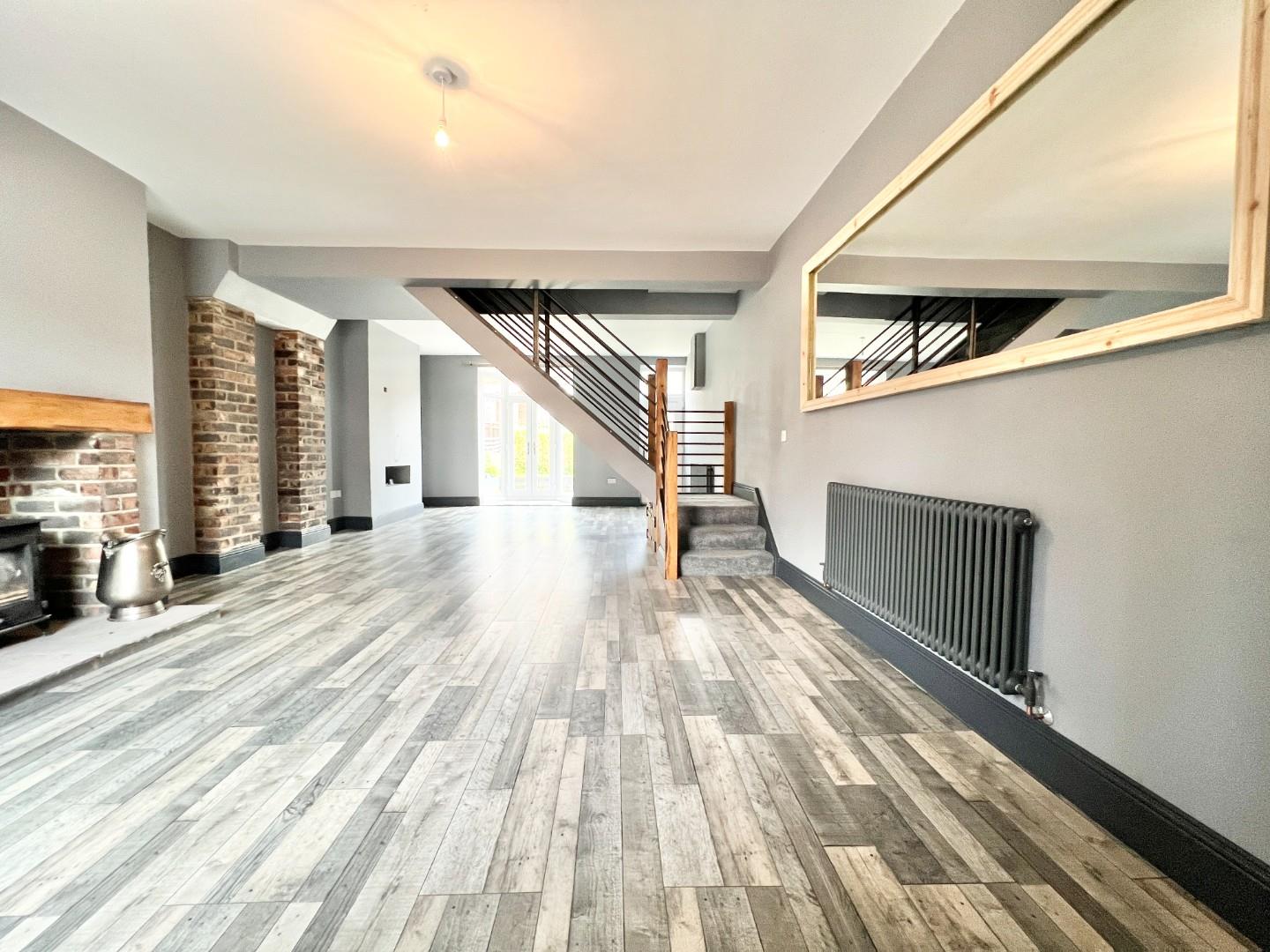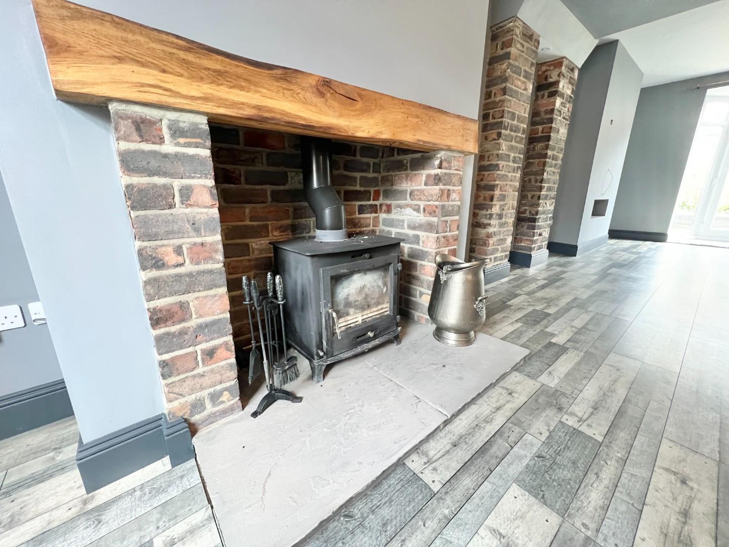 The internal accommodation comprises; impressive open plan reception room with central staircase to the first floor. This room has ample space for furniture and a log burning stove in inglenook and attractive exposed rustic brick walls, French doors lead to the front garden. Re-fitted kitchen with a range of contemporary wall, base and drawer units with integrated dishwasher, hob and oven, space for washing machine and fridge/freezer. The roof over the kitchen has also been recently updated, ensuring peace of mind for the new owners.