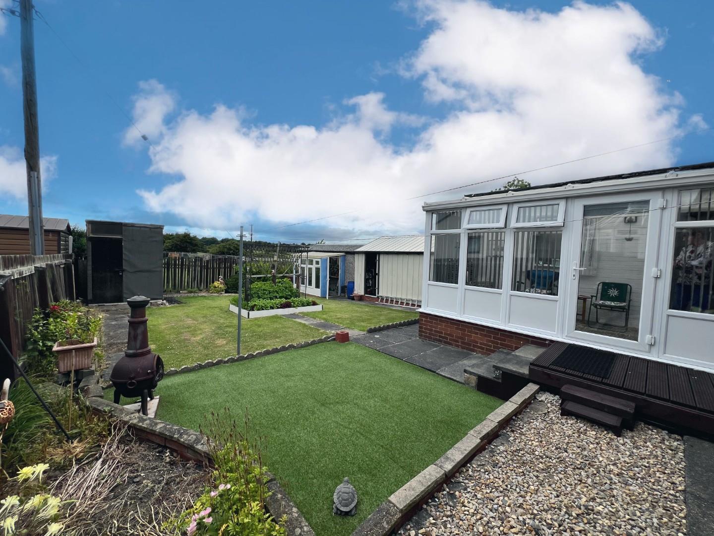 In brief the property comprises of; entrance hallway, spacious lounge with feature gas fire, separate dining room good sized modern white kitchen, conservatory, two double bedrooms and shower room. Externally to the front elevation is a easy to maintain lawn and driveway which leads to the large garden and garage/workshop.