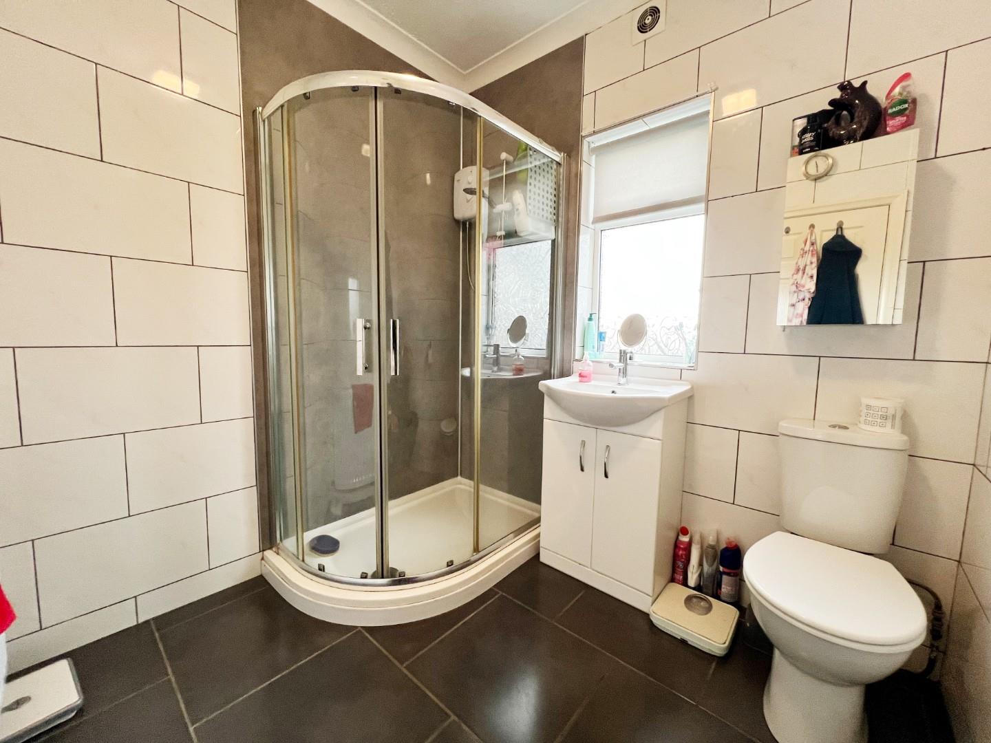 Fully tiled suite, shower cubicle, wash hand basin, W/C, radiator, uPVC window, extractor fan.