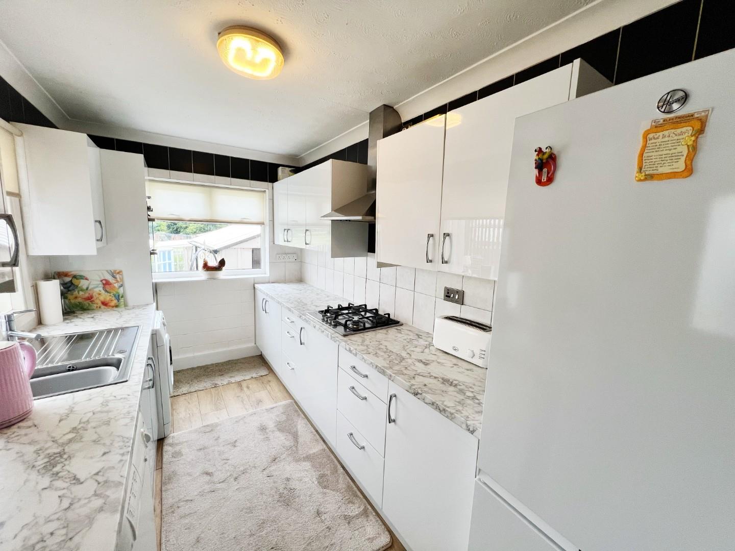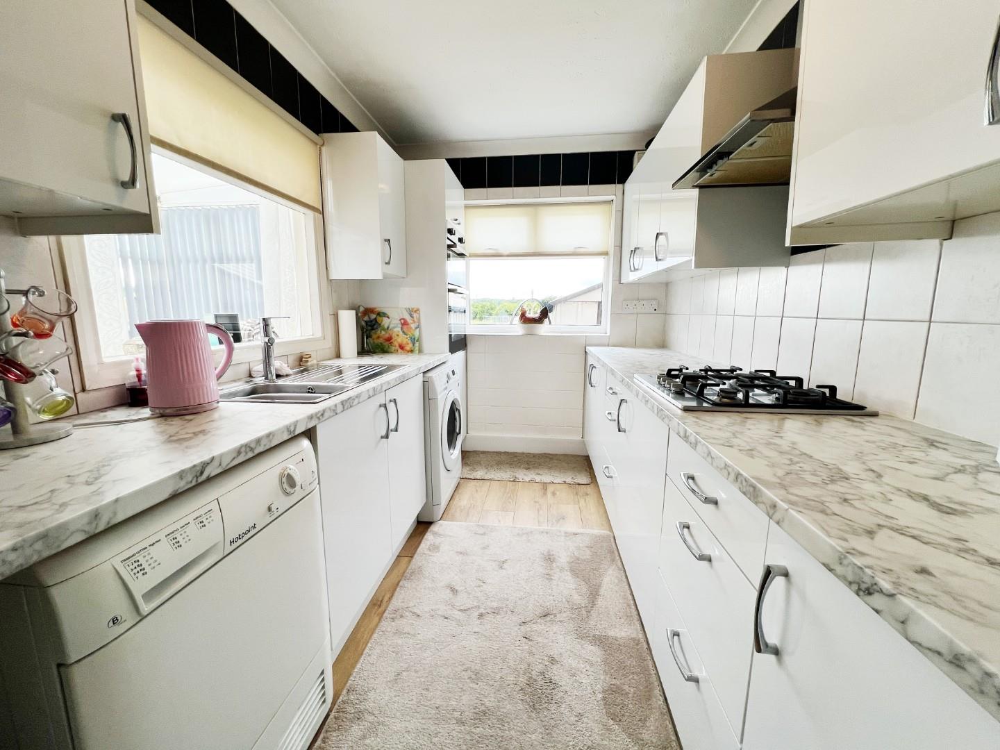 Modern white wall and base units, integrated oven, hob, extractor fan, plumbed for washing machine, stainless steel sink with mixer tap and drainer, uPVC window, tiled splashbacks.