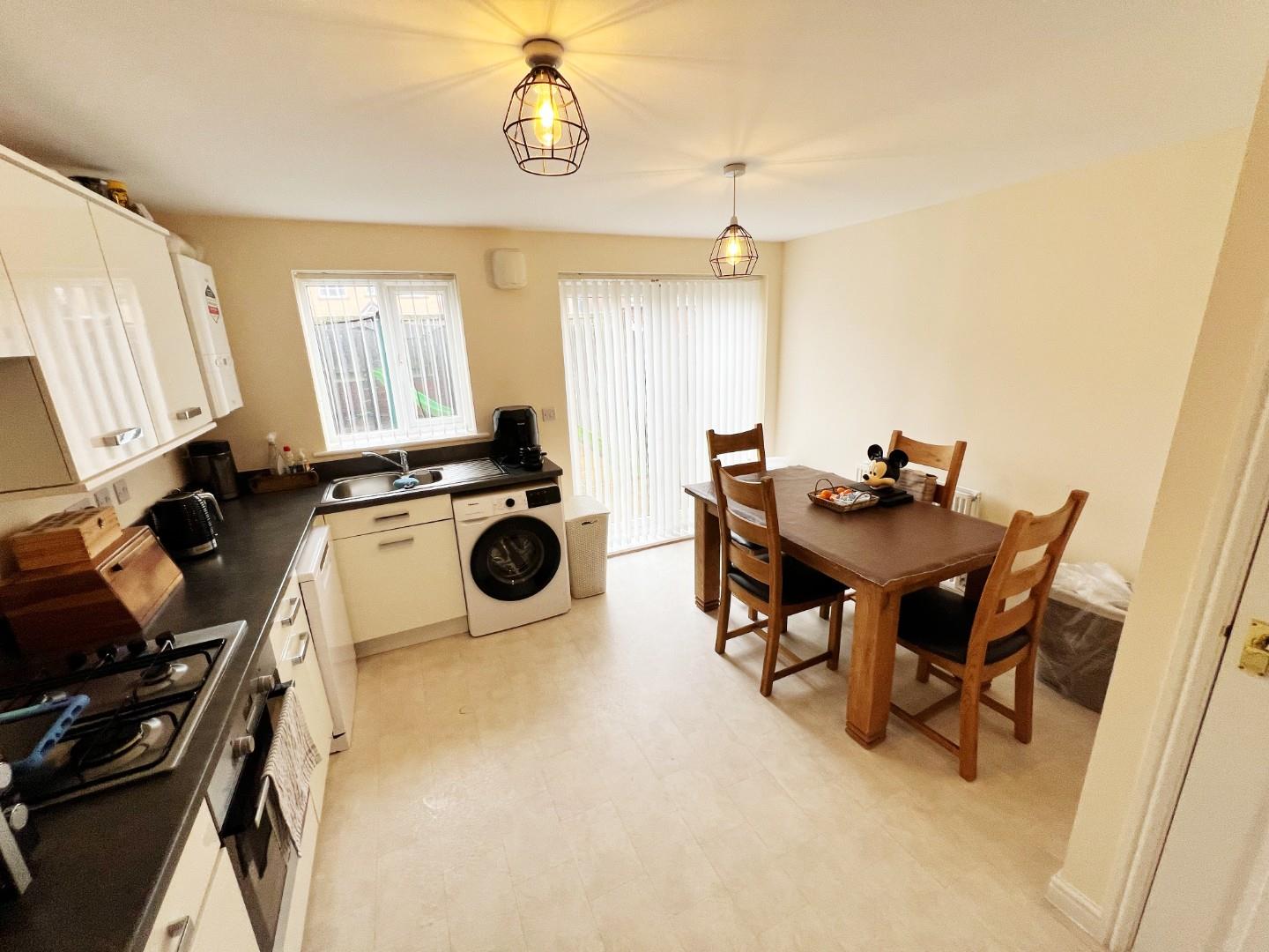 Modern wall and base units, integrated oven, hob, extractor fan, plumbed for washing machine, space for fridge freezer, stainless steel sink with mixer tap and drainer, uPVC window, space for dining room table, storage cupboard, French doors leading to the rear.