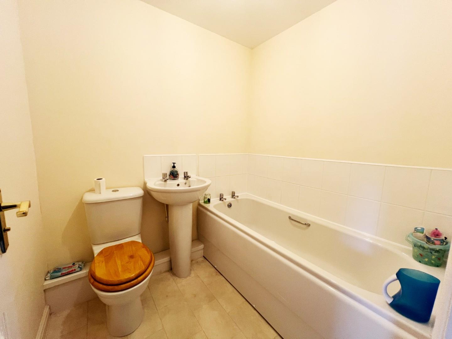 White panelled bath, wash hand basin, extractor fan, tiled splashbacks.
