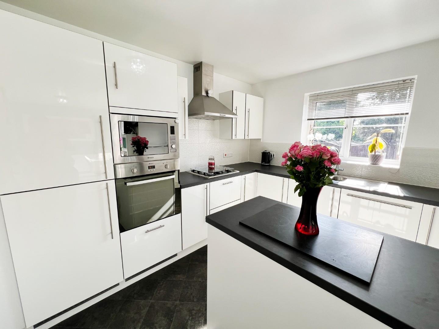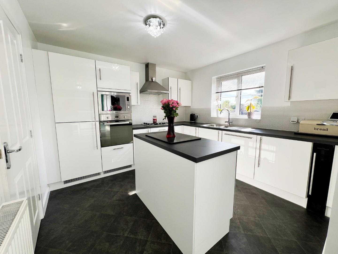 Modern white wall and base units, integrated oven, hob, microwave, dishwasher, fridge freezer, uPVC window, radiator, stainless steel sink with mixer tap and drainer, central island, space for dining room table, radiator, french doors leading to rear, tiled splashbacks.