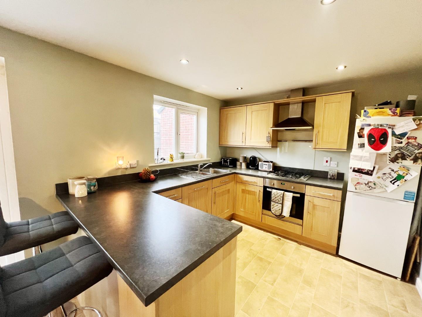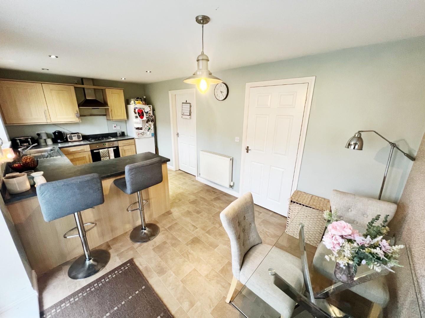 Wall and base units, integrated oven, hob extractor fan, dishwasher, space for fridge freezer, breakfast bar, uPVC window, radiator, space for dining room table, spot lights, french doors leading to rear.