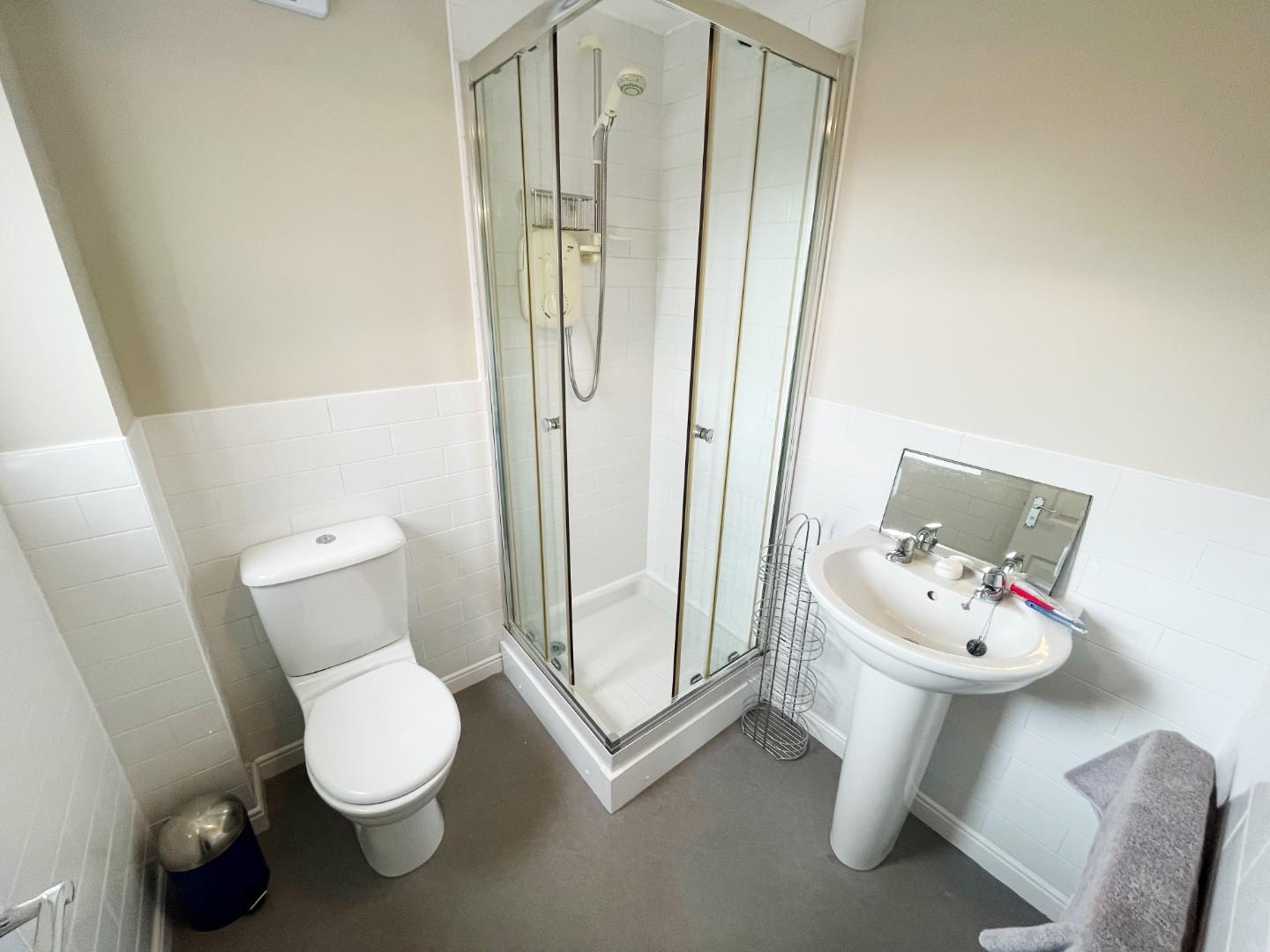 Shower cubicle, wash hand basin, W/C, radiator, extractor fan, tiled splashbacks, uPVC window, radiator.