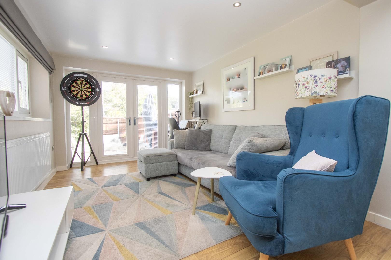 The floor plan comprises: hallway, comfortable lounge with feature wood burning stove, stunning open plan and extended living, kitchen and dining room. This focal and versatile space is fitted with modern fixtures, has a range of appliances and provides space for dining, entertaining and relaxing. There is also French doors opening to the rear decked patio area. Completing the ground floor is a WC and garage. The first floor has three bedrooms and family bathroom fitted with a modern white suite including over bath shower. Outside are lovely gardens, parking and garage.